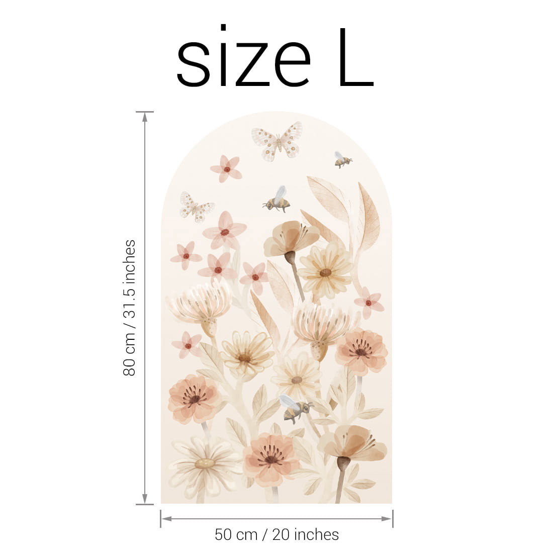 This arched wall decal with flowers brings the ambiance of a summery meadow to the nursery. The refined composition of wildflowers, grasses, and leaves, in soft earth tones, creates a sense of tranquility, warmth, and a natural feel. A harmonious accent that fits perfectly in a lovingly decorated nursery.