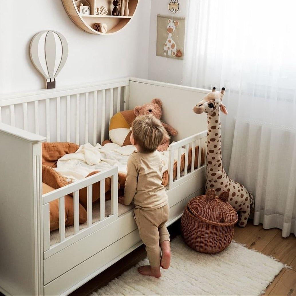 The cot grows with your child. Thanks to its three adjustable mattress heights, the bed can be easily adapted to your baby's age. As your child grows, the cot can be converted into a sofa by removing one side. The included safety barrier ensures your child can sleep safely when the bed is used as a sofa.