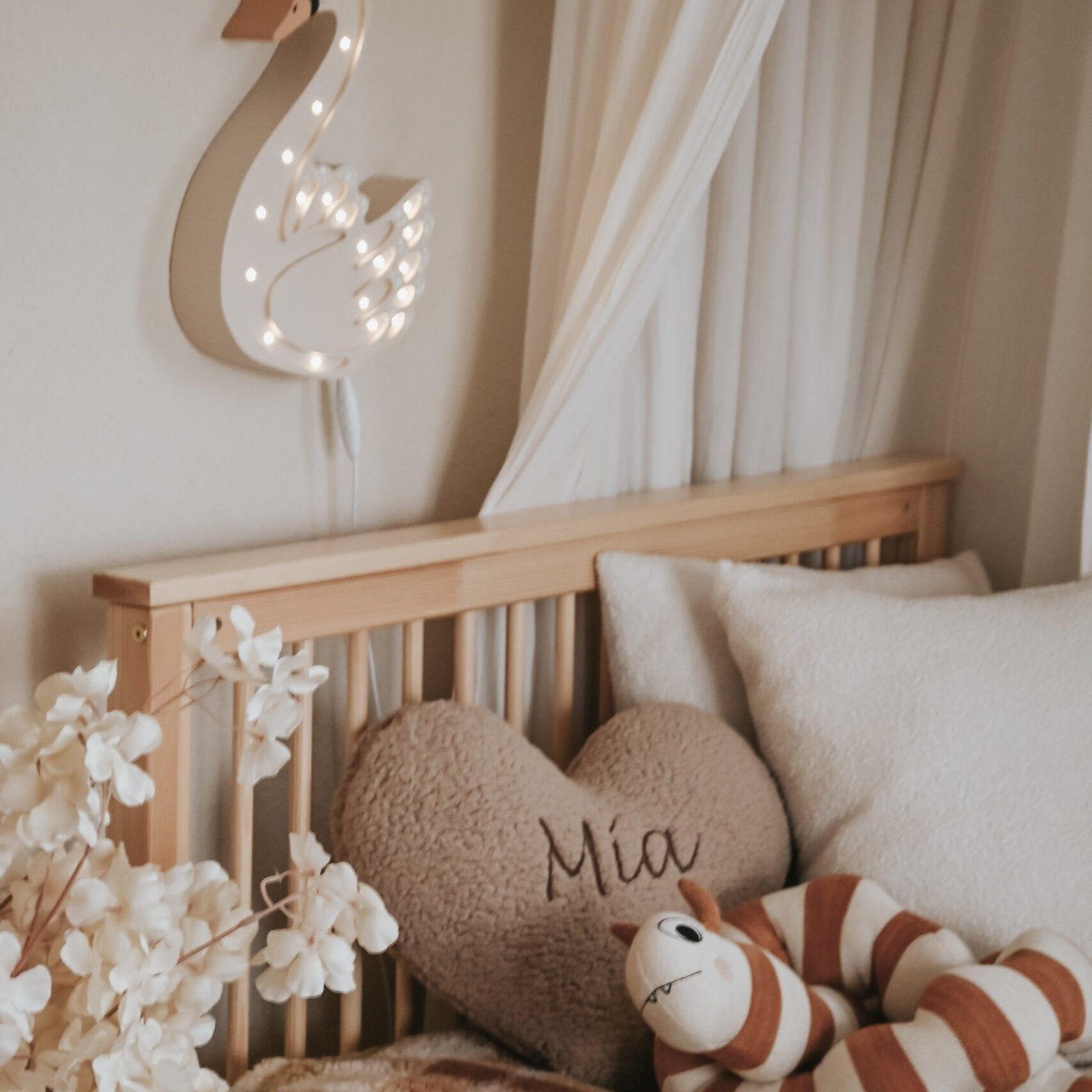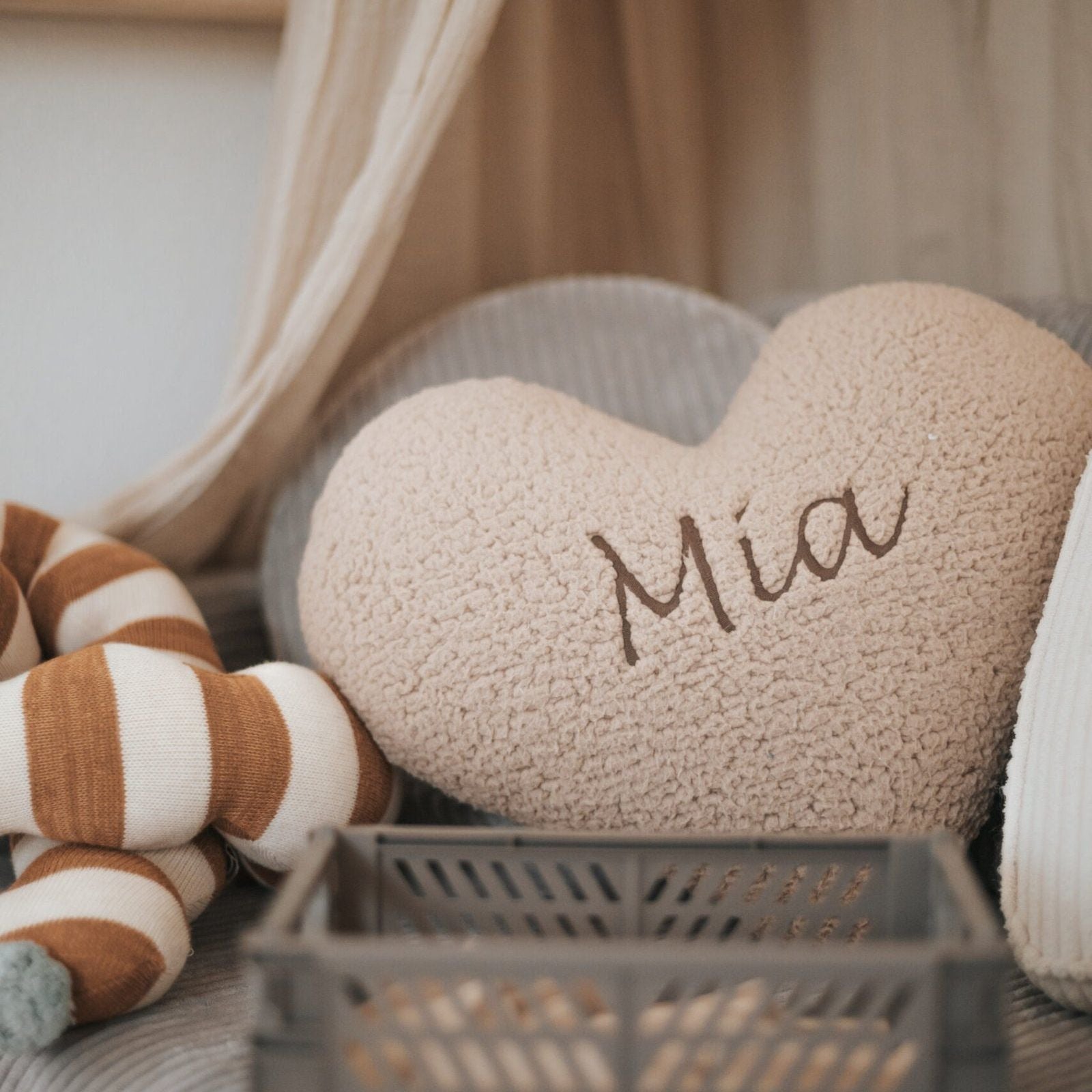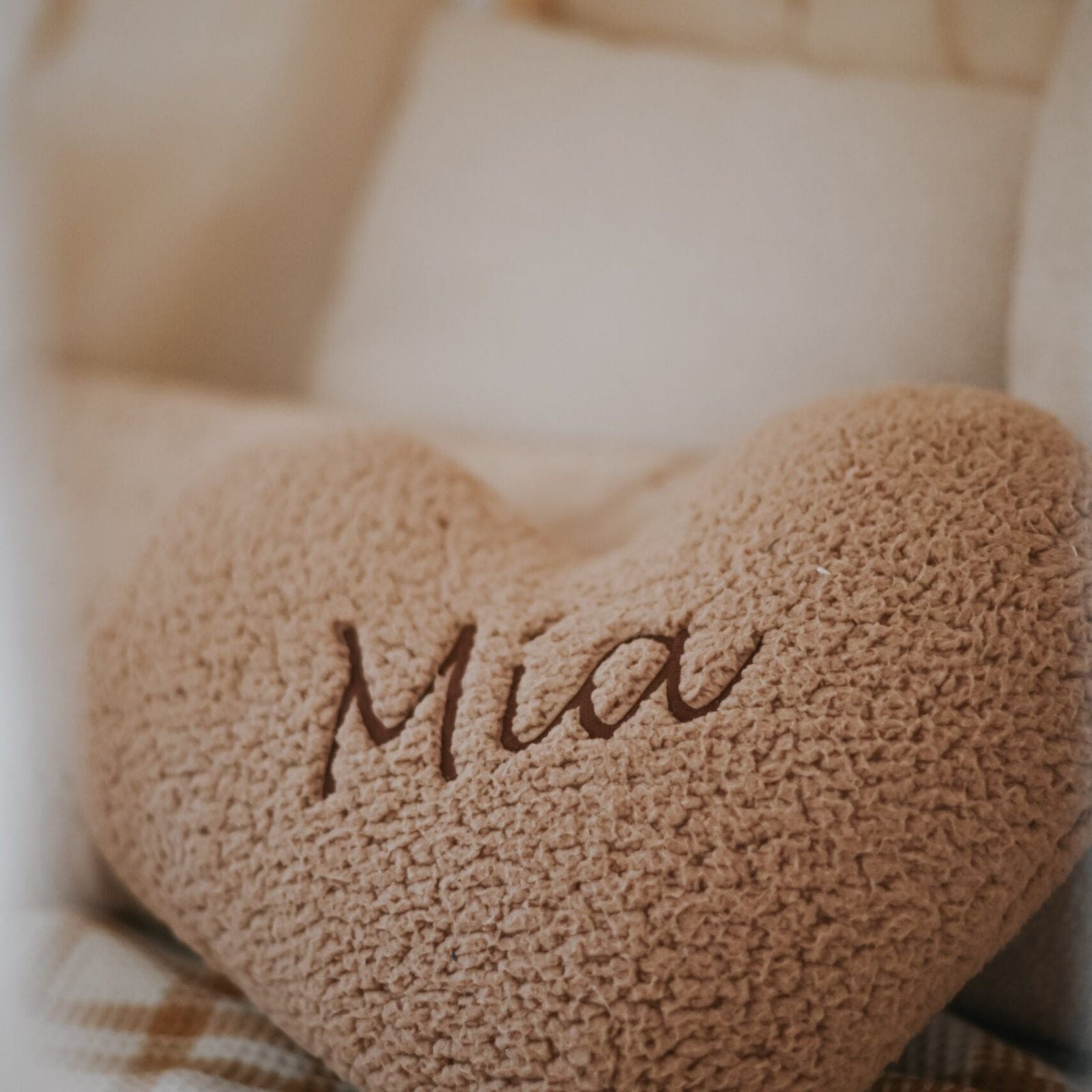 A beautiful teddy bear decorative pillow in the shape of a heart with your child's name on it! Ideal for decorating a nursery, but also a wonderful (maternity) gift!