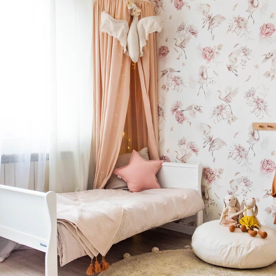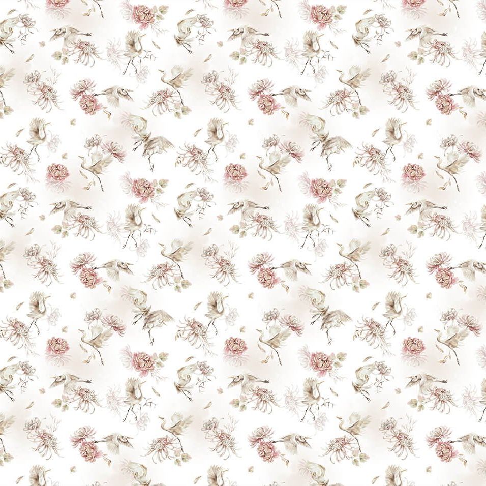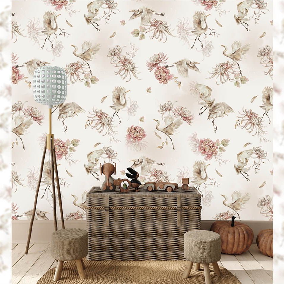 Magnifique papier peint orné d'oiseaux et de fleurs. Fabriqué à partir de matériaux certifiés, il est imprimé avec des pigments écologiques certifiés.