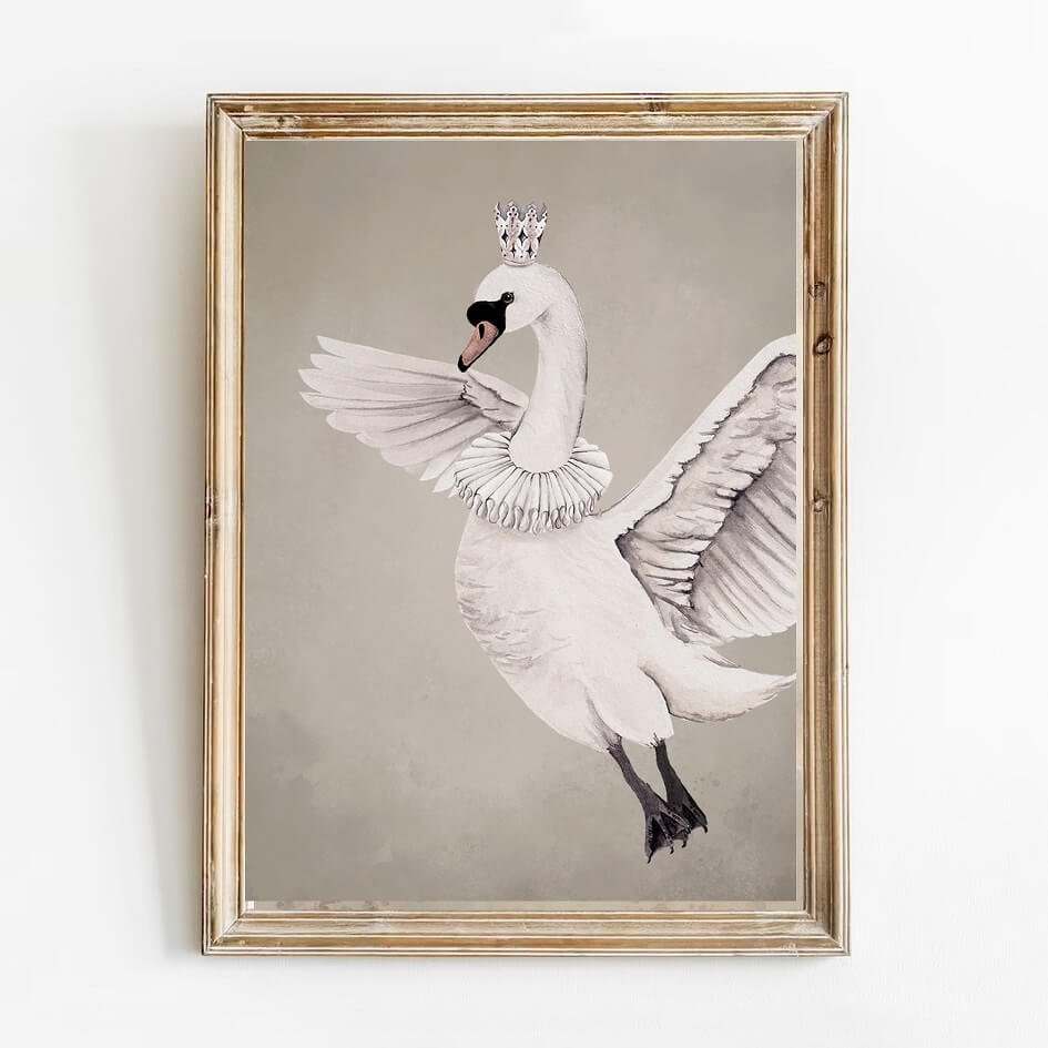 Magnifique affiche onirique avec un cygne. Cadre blanc inclus. Livrée prête à accrocher !