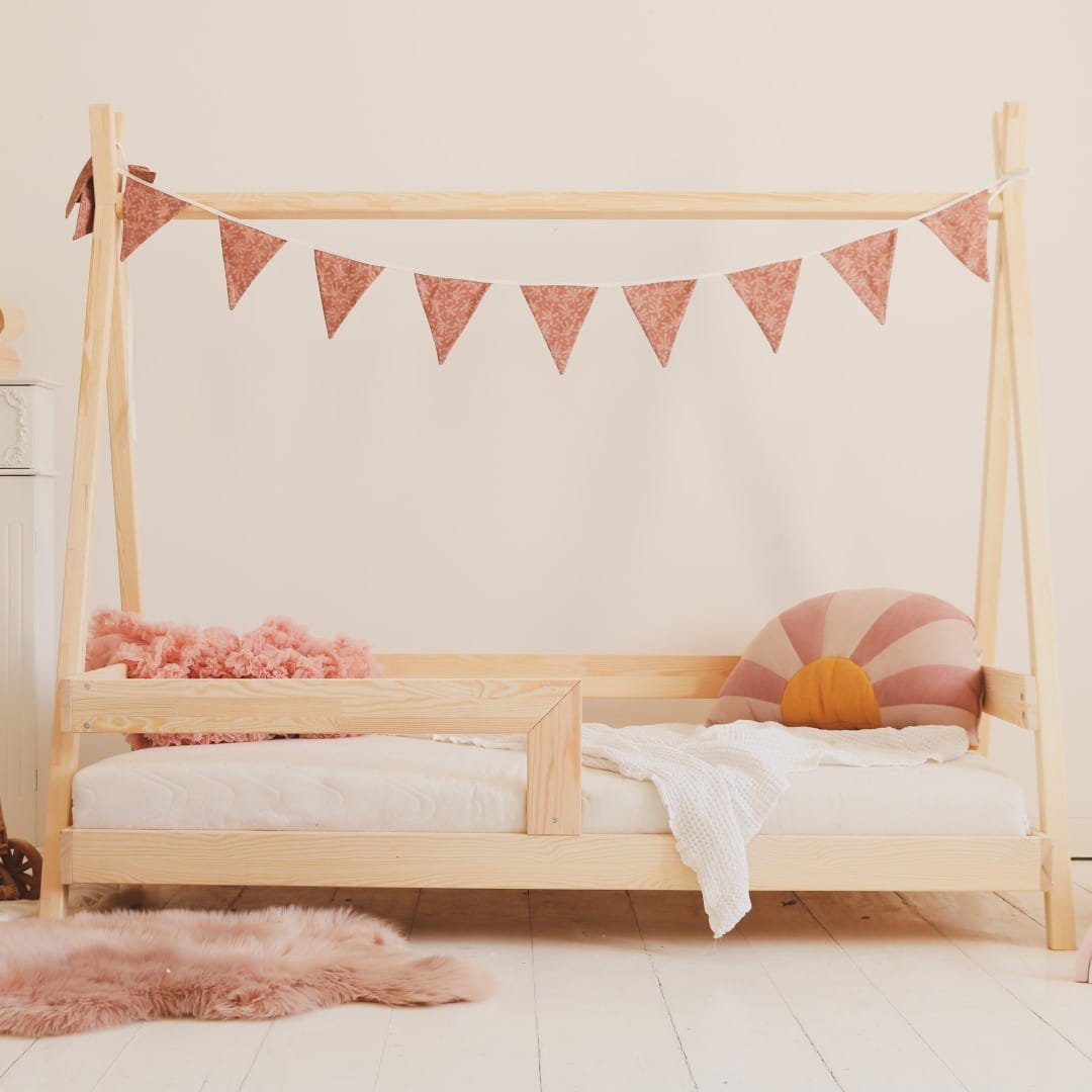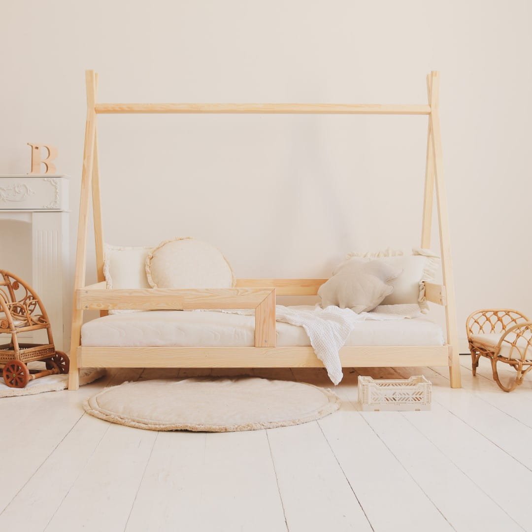 Magnifique lit tipi en bois, idéal pour dormir et offrant également un espace de jeu idéal ! Ce lit est livré avec un cadre de lit complet et un sommier. Chaque latte doit être vissée au cadre à l'aide des vis fournies. La barrière peut être montée de chaque côté (droite et gauche).