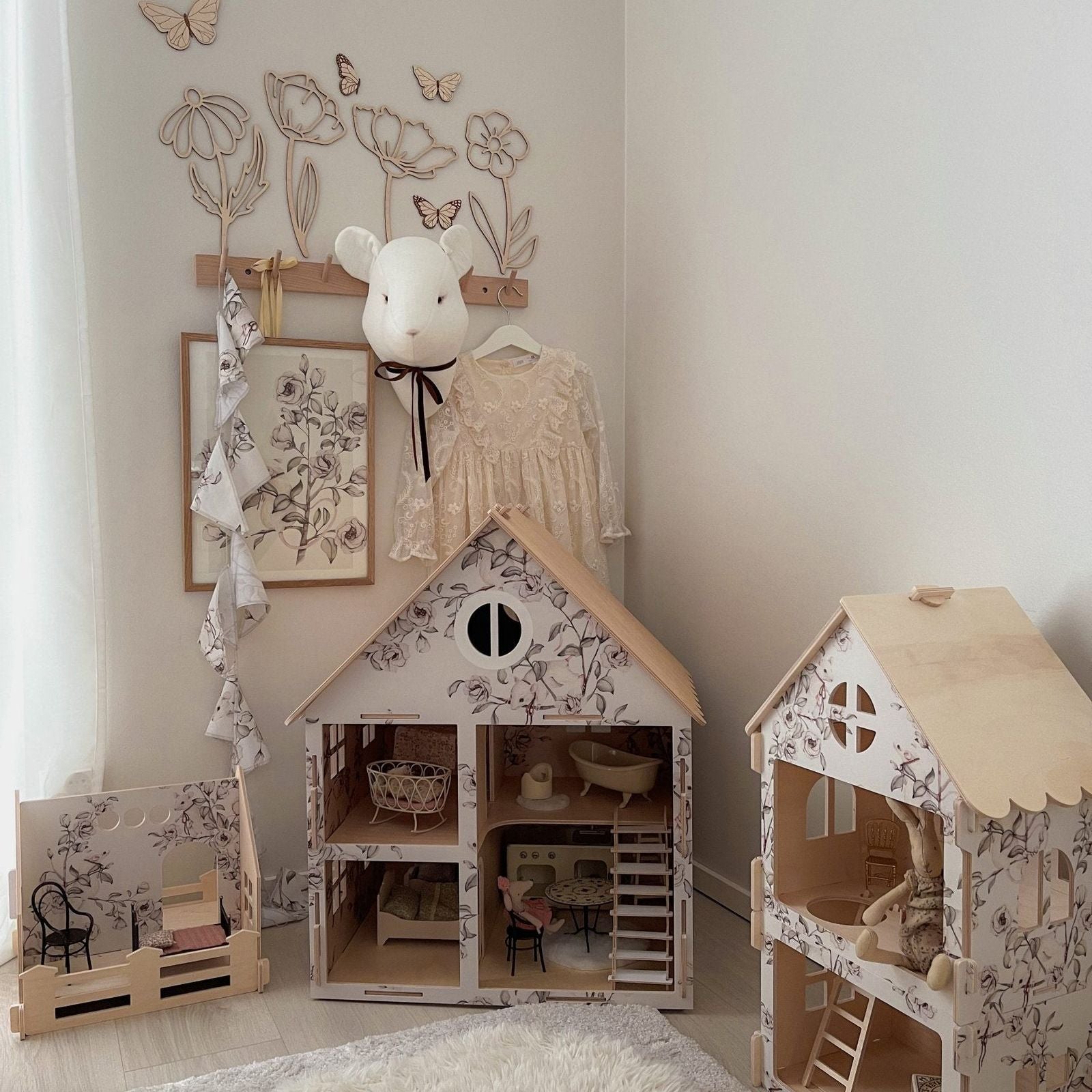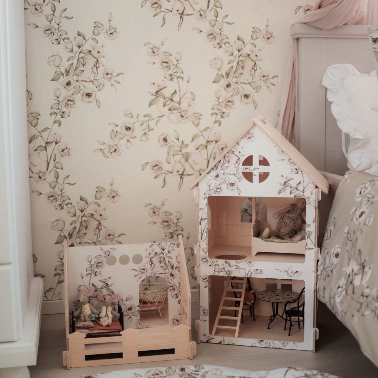Prachtig houten poppenhuis versierd met de prachtige bloemen en muizen print. Hier kan je kindje urenlang mee spelen! Dit formaat is ideaal om mee te nemen onderweg! In de auto of mee naar een play date! Ook verkrijgbaar in de kleur taupe.