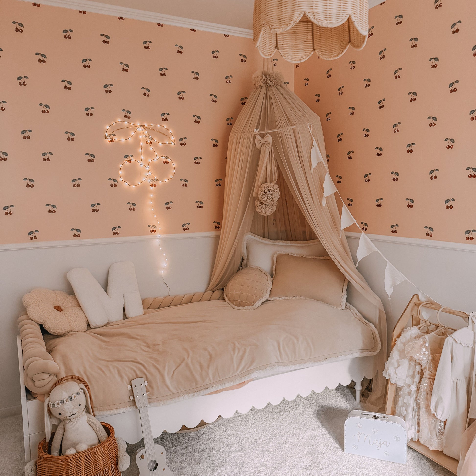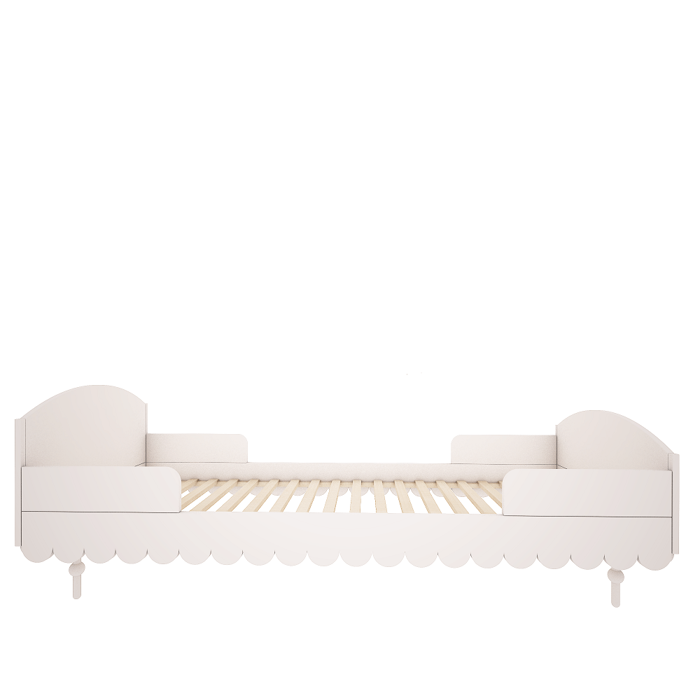 Zeer charmant kinderbed in fijne retrostijl. De afstand van de vloer tot de 'franje' is 17cm. De veiligheid hekjes zijn afneembaar - ze vormen geen integraal onderdeel van het bed. Bed is aangepast aan matras maat 90 × 200 cm.