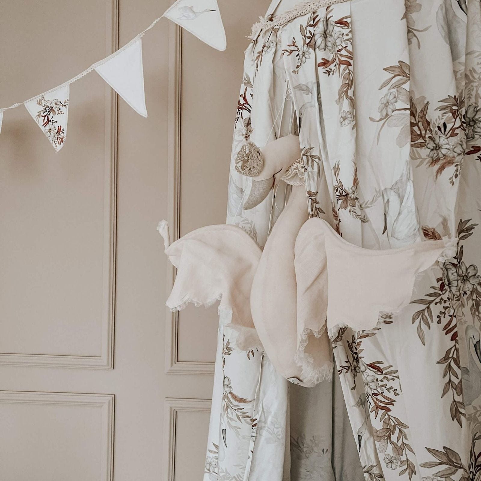 Deze prachtige handgemaakte bedhemel zal magisch staan boven het bedje of ledikant van jouw kleintje! De zwanen print creëert een dromerig geheel, je kleintje zal zich geborgen voelen onder deze prachtig bedhemel welke afgezet is met een mooie katoenen fringe!