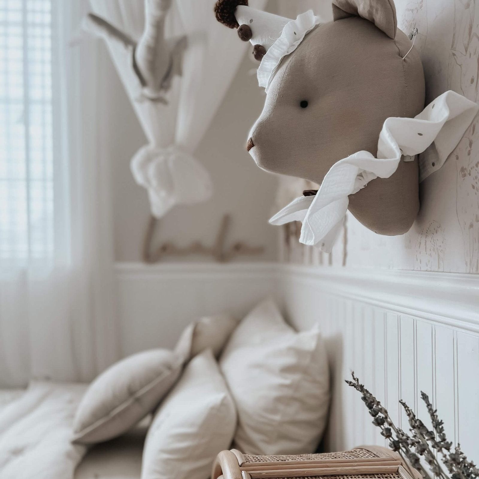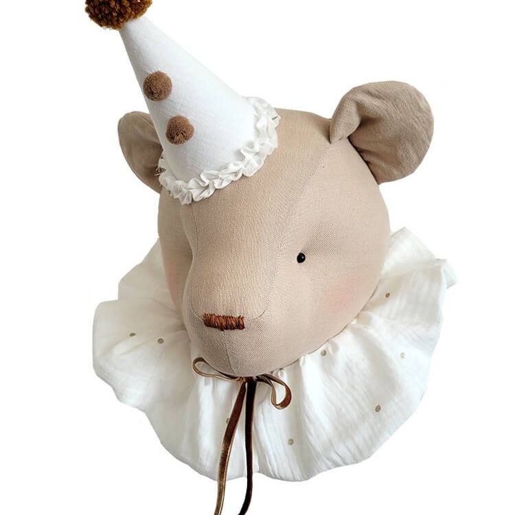 Prachtige handgemaakte linnen beer voor aan de wand. In meerdere kleuren verkrijgbaar. Let op: Dit item is puur ter decoratie, laat je kind hier niet mee spelen. Buiten bereik van kinderen houden.