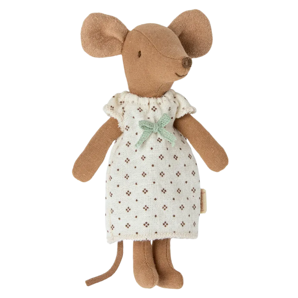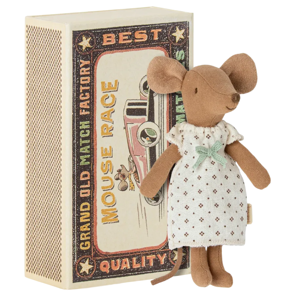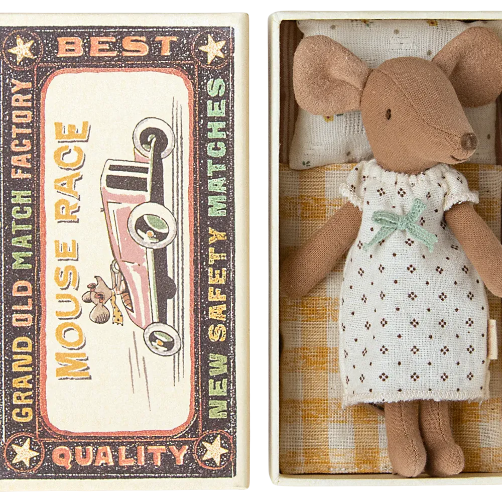 Lieve Big Sister Mouse in lucifer doosje in haar schattige nachthemd van Maileg voor in je poppenhuis. Grote Zus muis woont in een mooi luciferdoosje. Ze slaapt het liefst in haar schattige nachthemd onder haar geblokte deken en op haar mooie kussen. Een mooi cadeau voor jong en oud! Bijpassende poppenhuizen zie hier.