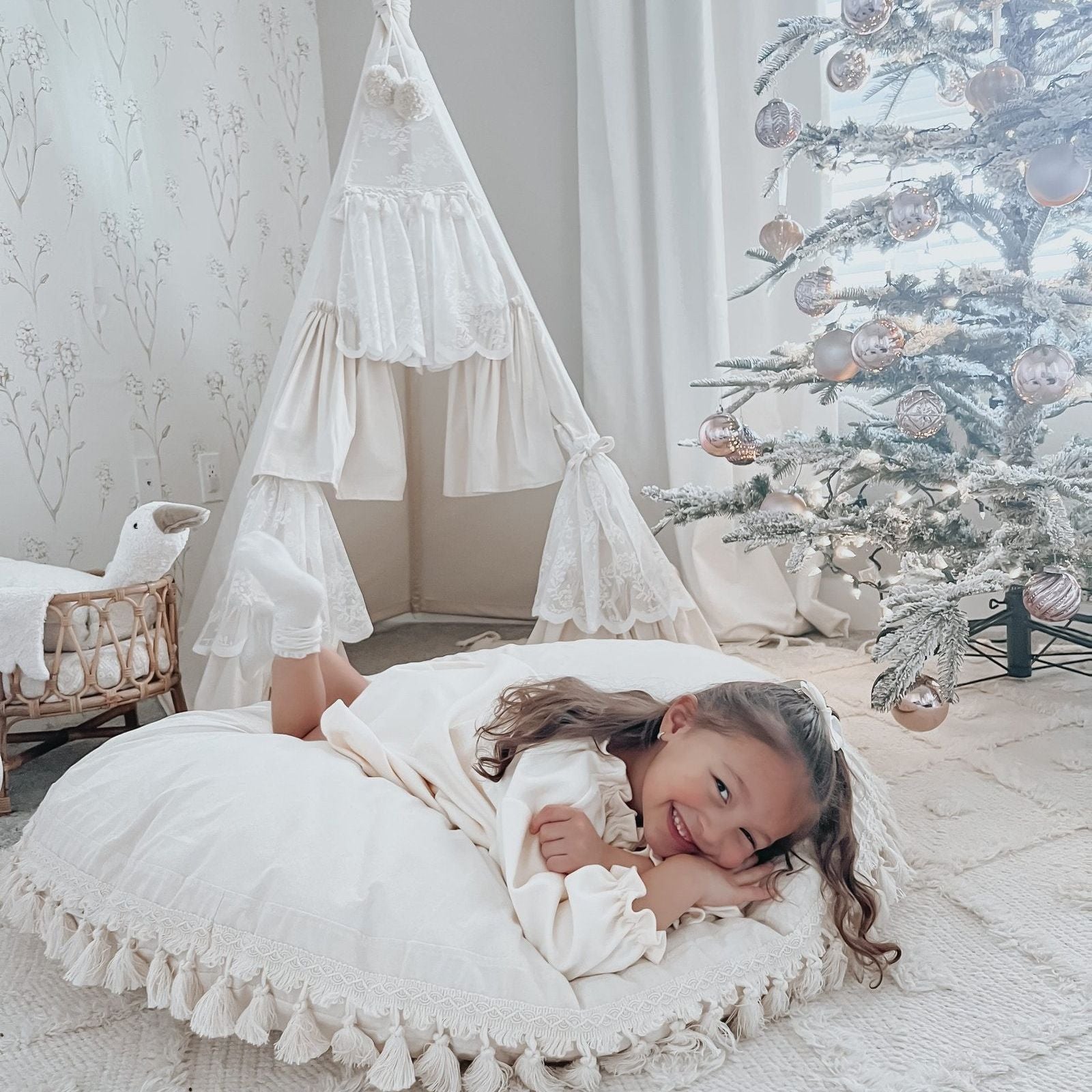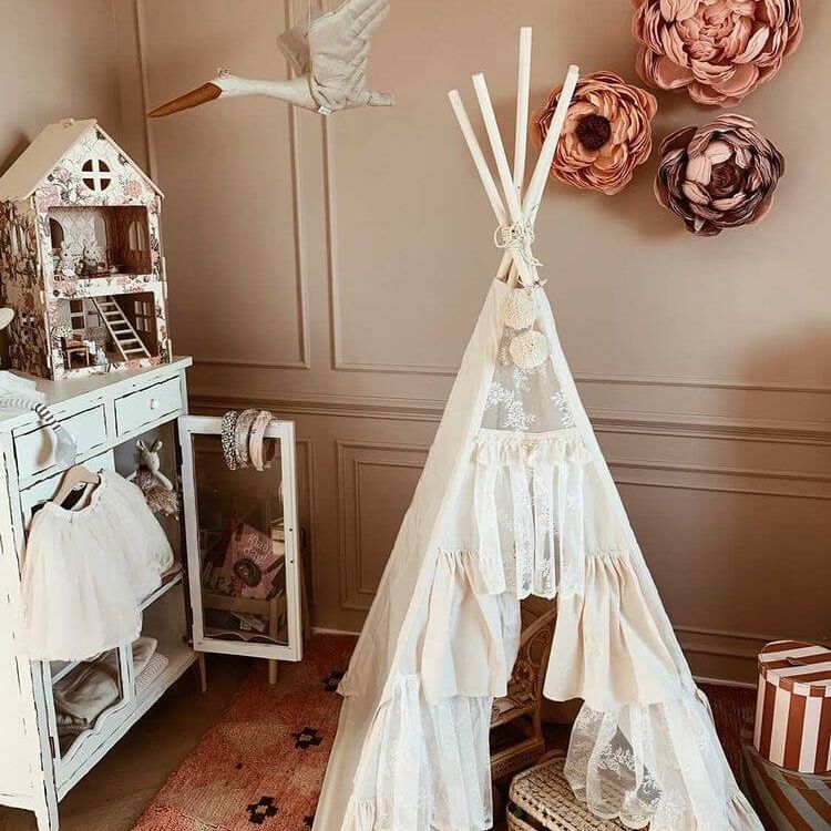 Deze prachtige beige tipi tent is versierd met mooie gordijnen wat hem een speelse boho look geeft!