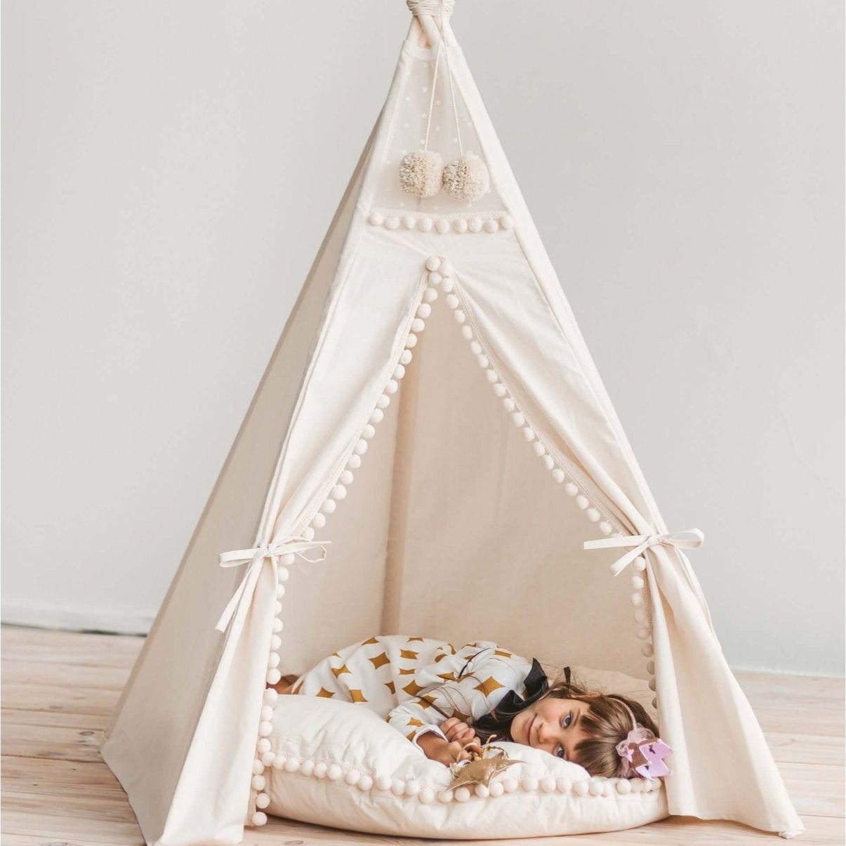 Deze beige kinder tipi is versierd met prachtige pompoms wat hem een speelse boho look geeft!