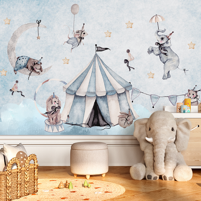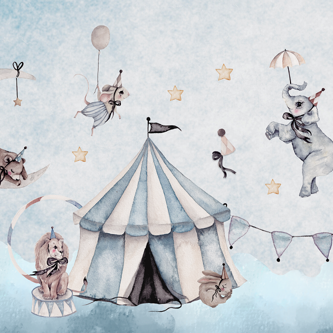 Prachtig circus behang. Gedrukt op hoogwaardig fleece, zorgt het voor duurzaamheid en weerstand tegen beschadiging. Let op: Al het behang wordt door de grafisch ontwerper van de drukkerij gesneden, ze zijn zo ontworpen dat het hoofdelement, b.v. een zwaan of een paard in het midden staat.
