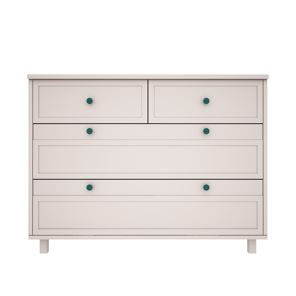 Uiterst charmante ladekast in vintage stijl in warm grijs/beige kleur. De kast heeft meerdere lades voorzien van hoogwaardige geleiders.