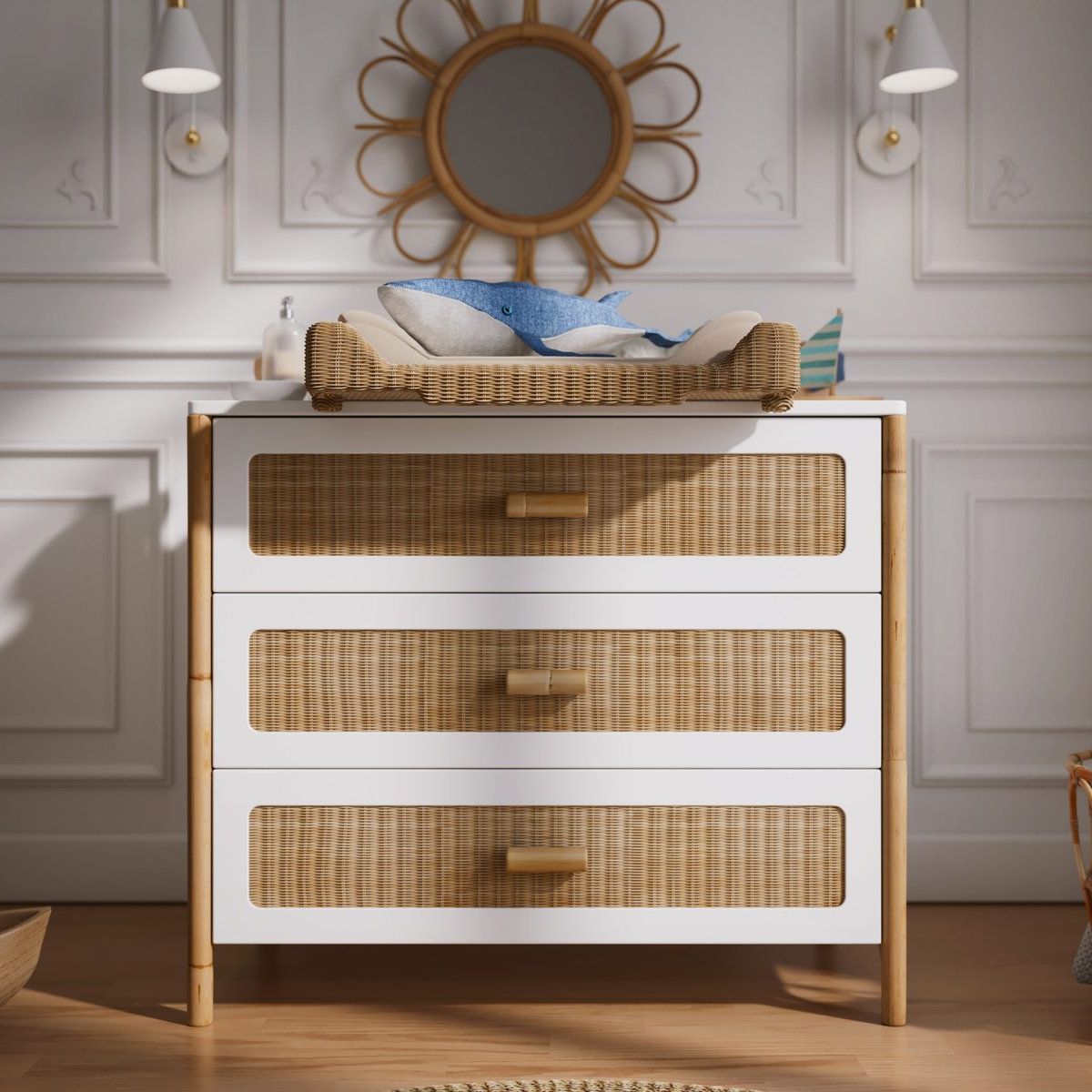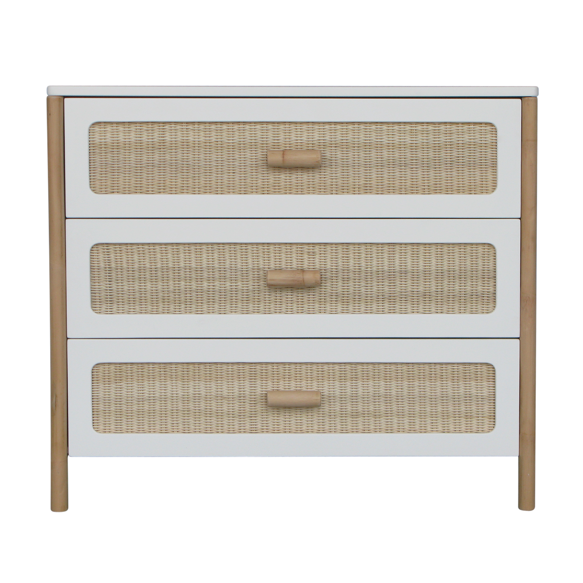 Deze prachtige kast/commode heeft drie grote laden. Deze hebben soft close sluitingen en panelen van natuurlijk rotan. Teven zijn de poten van rotan/riet