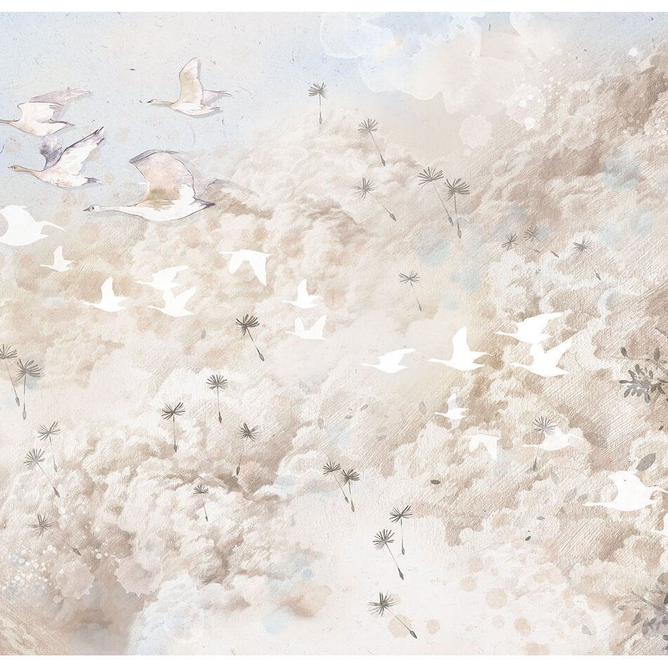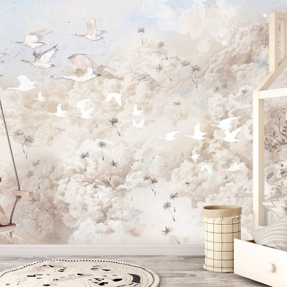 Prachtig dromerig behang met vogels en wolken. Dit behang is gemaakt van gecertificeerde materialen,er word geprint met ecologische, gecertificeerde pigmenten.