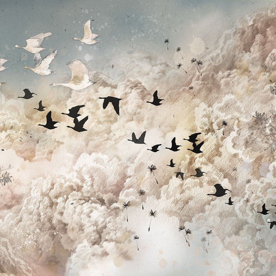 Prachtig dromerig behang met vogels en wolken. Dit behang is gemaakt van gecertificeerde materialen,er word geprint met ecologische, gecertificeerde pigmenten.