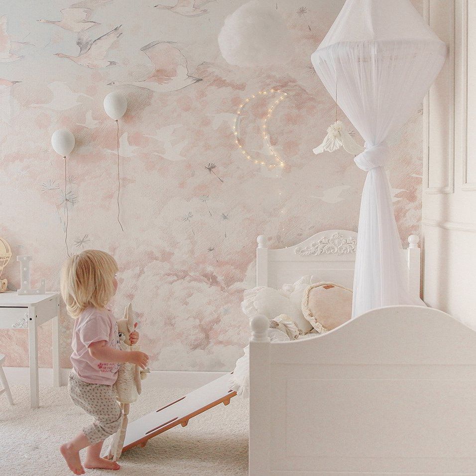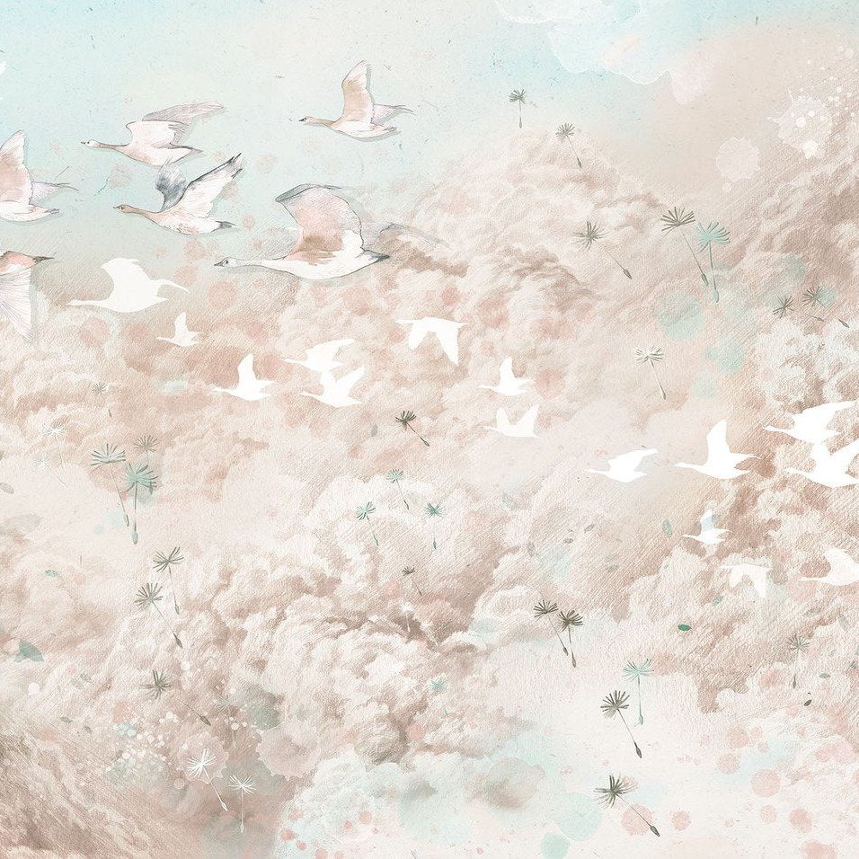 Prachtig dromerig behang met vogels en wolken. Dit behang is gemaakt van gecertificeerde materialen,er word geprint met ecologische, gecertificeerde pigmenten.