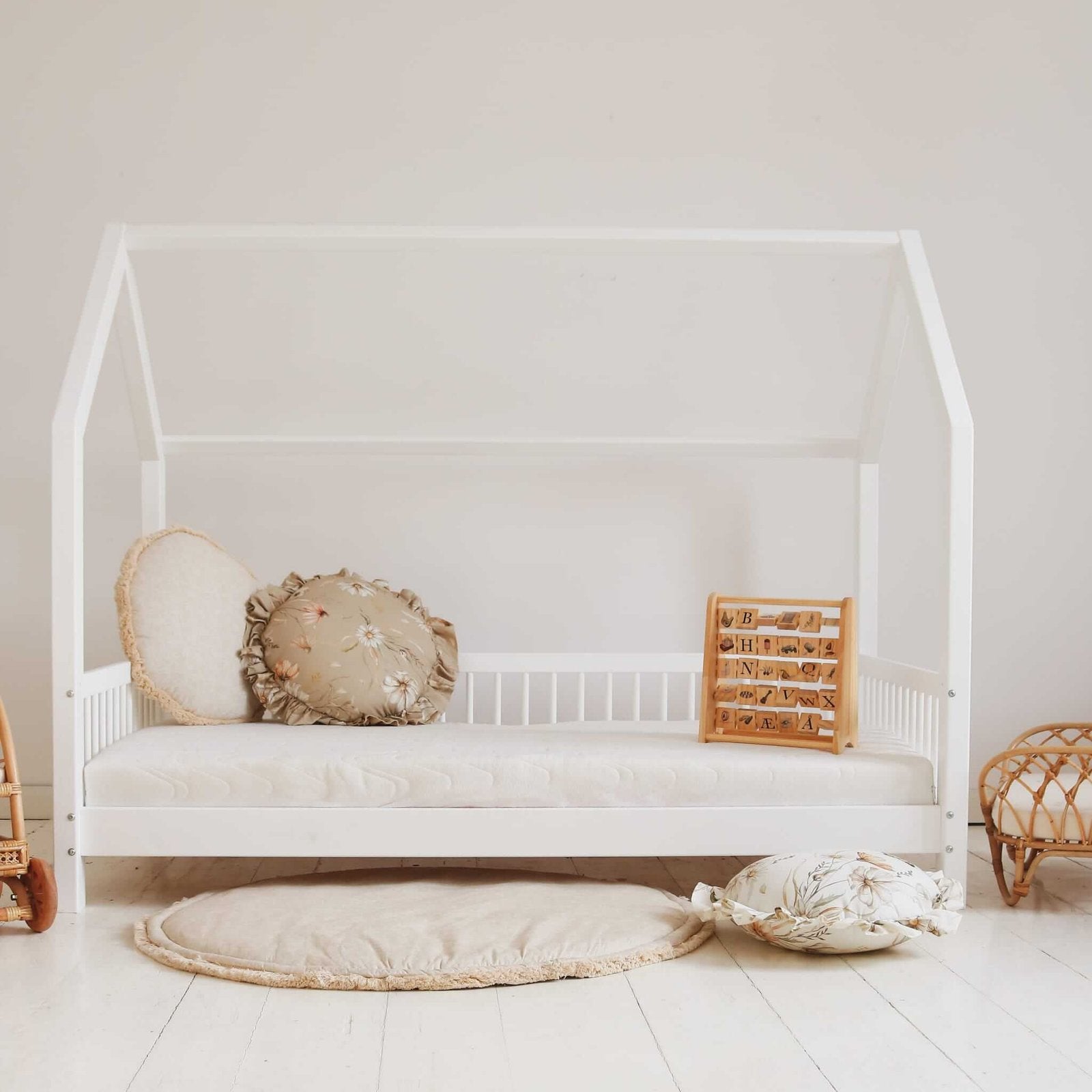 - Afmetingen:De totale hoogte van de rails vanaf het bedframe is ca. 25 cm.De opening tussen de spijlen is ca. 5 cm.De hoogte van de verticale balken om het dak te starten is 90 cm.Hoogste punt voor het bed met een bedbreedte van 80cm is 135 cm.Voor het bed met de bedbreedte 90cm is dat 140cm.De standaard hoogte van de poten is 10 cm.De poten van het bed zijn gemaakt van 45/65 mm elementen.Het bedframe is gemaakt van 90/20 mm elementen.Het matras past ca. 3 cm in het bedframe.Rekening houdend met de matras voor het 15 cm dikke bed, slaapt het kindje op een hoogte van ca. 31 cm.Bij de lengte van het bed moet je 9 cm optellen en bij de breedte 9 cm.