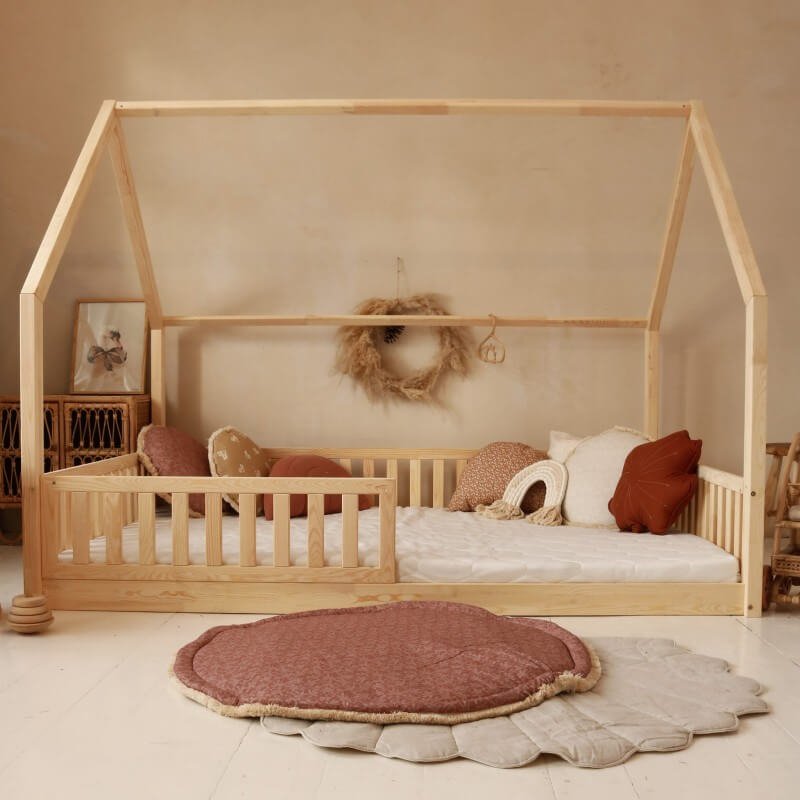 - Afmetingen:De totale hoogte van de rails vanaf het bedframe is ca. 29 cm. De hoogte van de verticale balken om het dak te starten is 90 cm.De poten van het bed zijn gemaakt van 45/65 mm elementen. Het bedframe is gemaakt van 90/20 mm elementen.Het matras past ca. 3 cm in het bedframe. Rekening houdend met de matras voor het 15 cm dikke bed, slaapt het kind op een hoogte van ongeveer 22 cm.Bij de lengte moet je 9 cm optellen en bij de breedte 9 cm bij de totale afmeting van het bed.