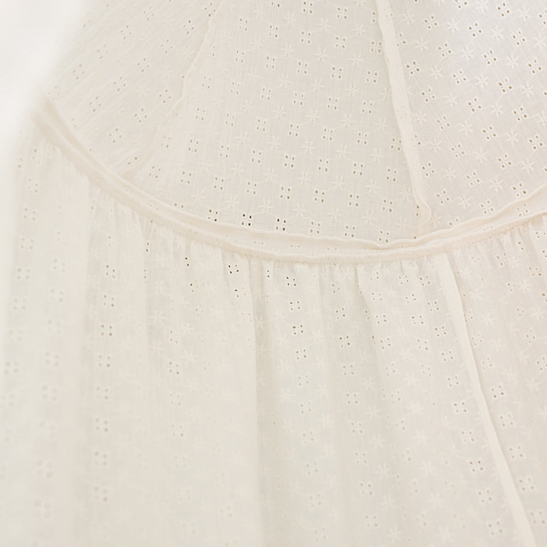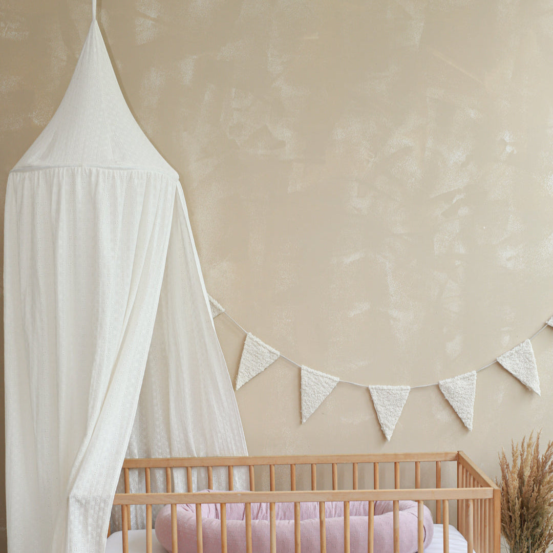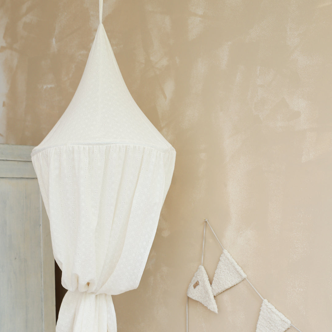 Deze prachtige bedhemel van 100% geborduurd katoen creëert een dromerige en geborgen sfeer in elke ruimte. De luchtige stof laat licht en lucht zacht door en vormt een stijlvolle blikvanger boven het bedje of speelhoekje. Dankzij het lint aan de binnenzijde kun je eenvoudig lichtjes of decoraties ophangen voor een extra magisch effect.