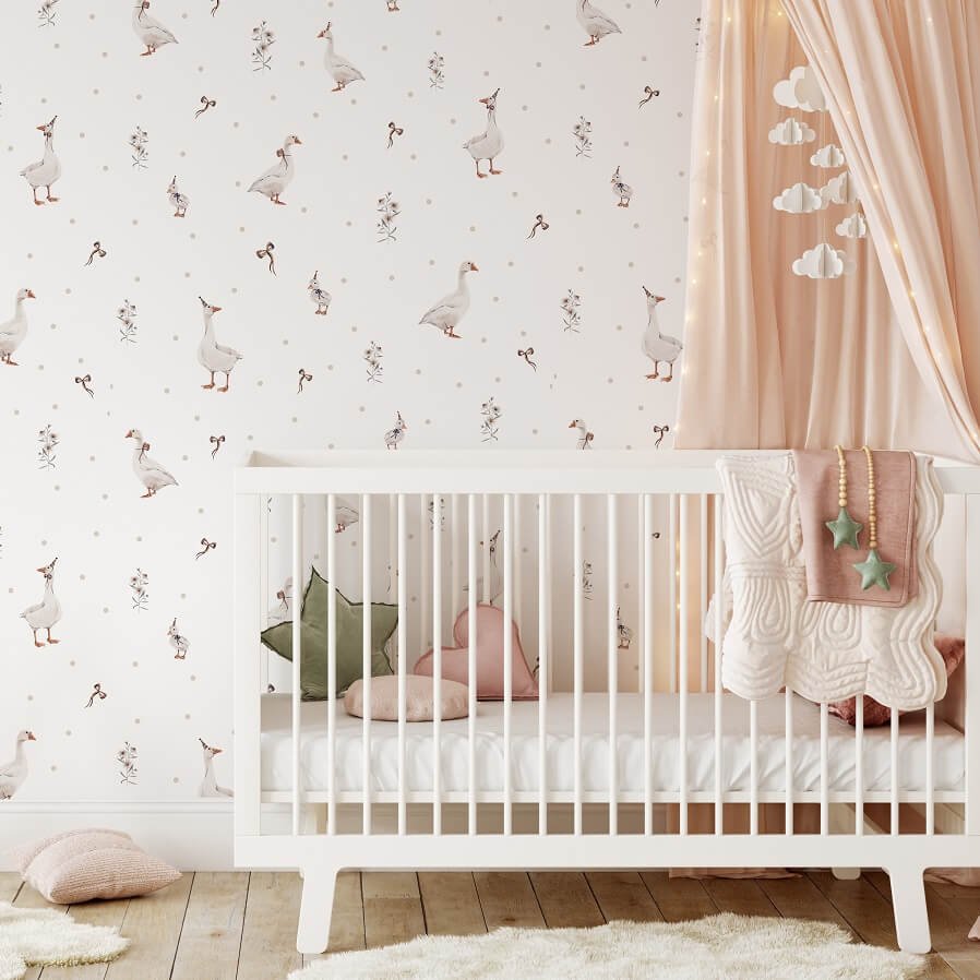 Prachtig behang met lieve ganzen print. Je ontvangt een rol behang van wel 10 meter.