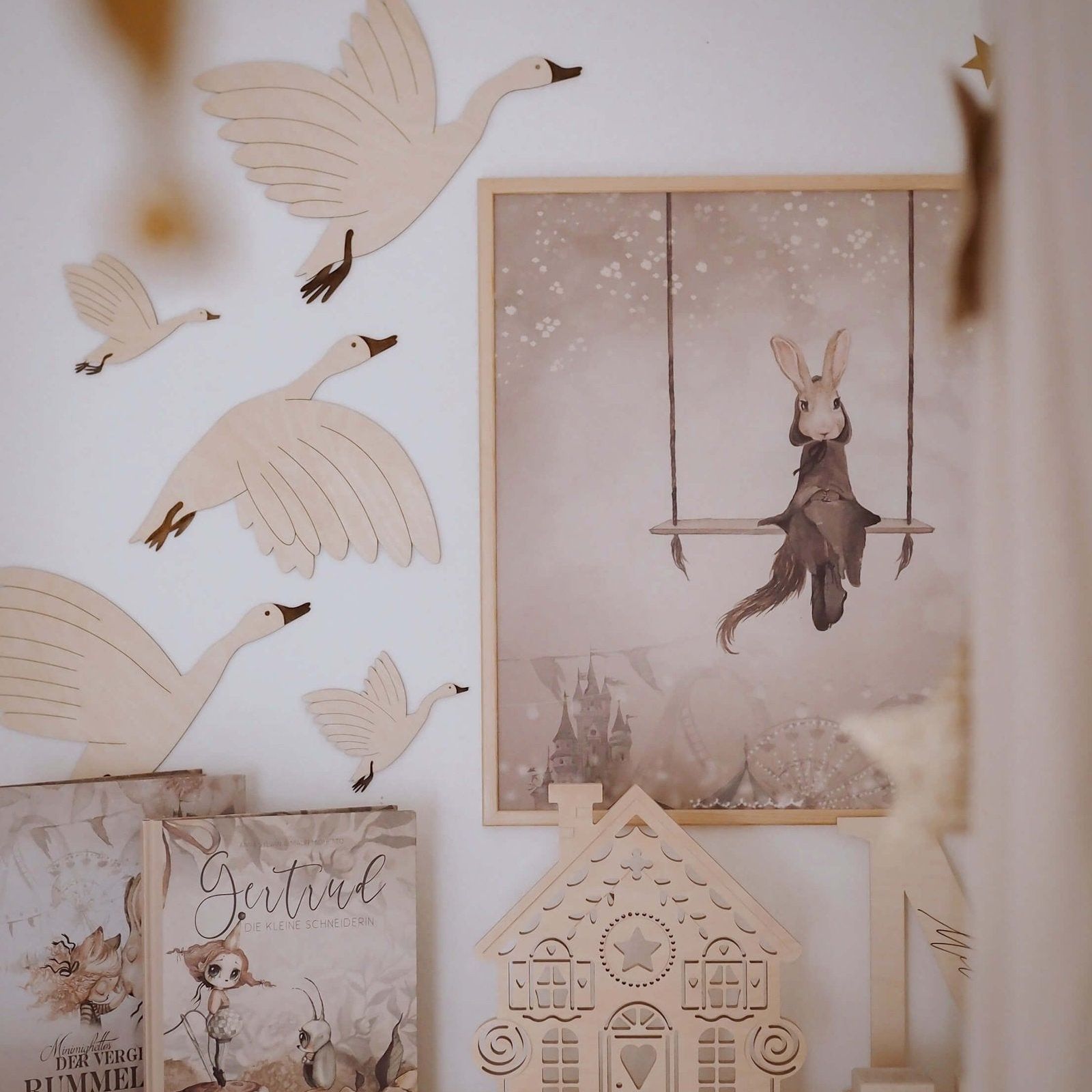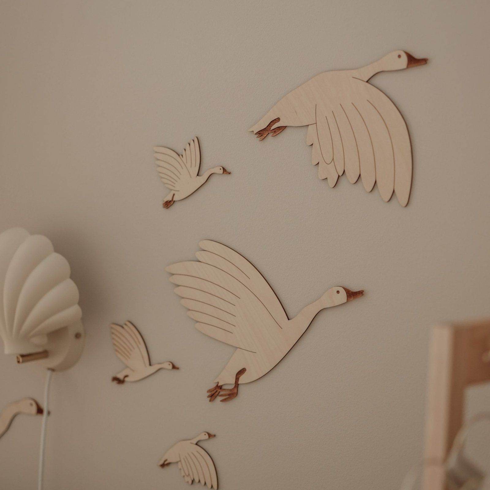 Prachtige houten wanddecoratie voor de baby- of kinderkamer. Deze set bestaat uit 6 ganzen: 3 grote en 3 kleinere. Een subtiele, natuurlijke toevoeging aan ieder interieur. De set wordt geleverd in een stijlvol geschenkdoosje, ook perfect om cadeau te geven.