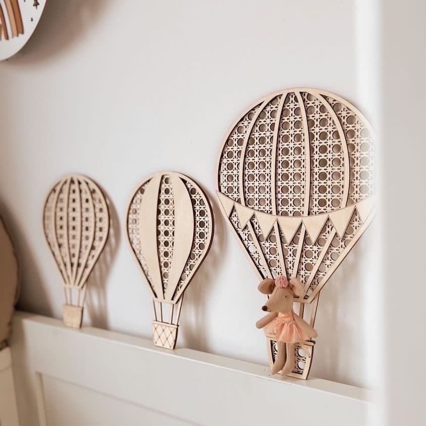 Breng sfeer in de kinderkamer met deze charmante houten wandset bestaande uit drie luchtballonnen en lieve sterretjes. Een tijdloos accent voor boven het bed of de commode.