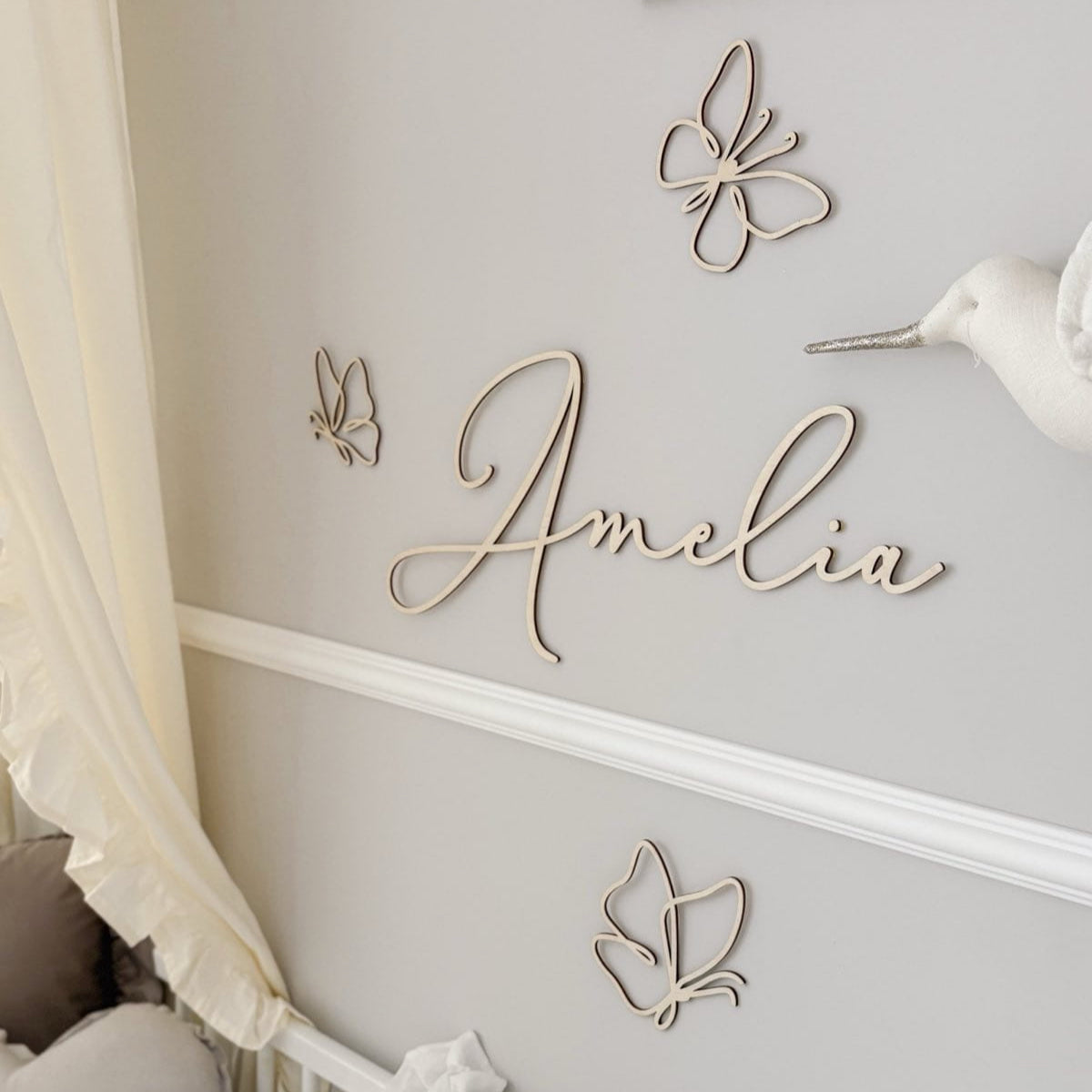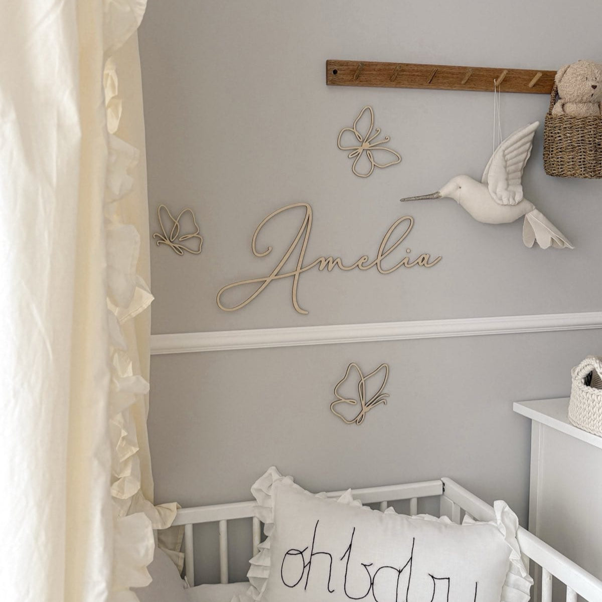 Prachtige houten wanddecoratie met naam en sierlijke vlinders. Een unieke toevoeging aan de kinderkamer die met zorg op maat wordt gemaakt. Dankzij het meegeleverde sjabloon is het ophangen eenvoudig, maar je kunt de woorden en vlinders ook naar eigen wens positioneren.