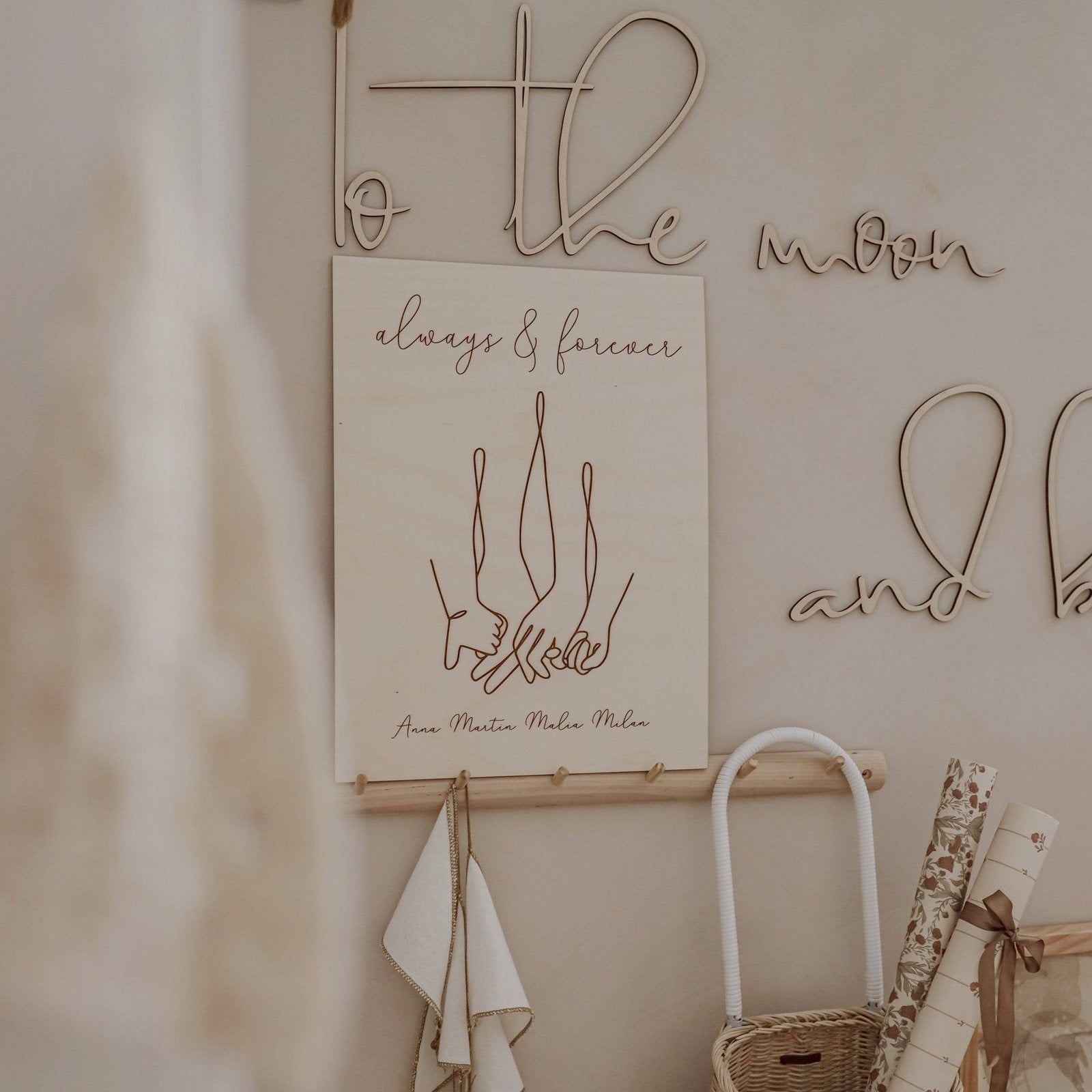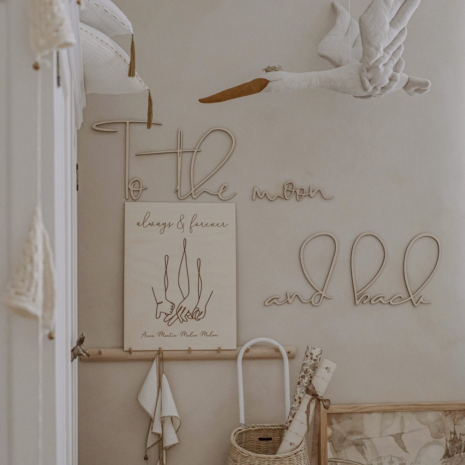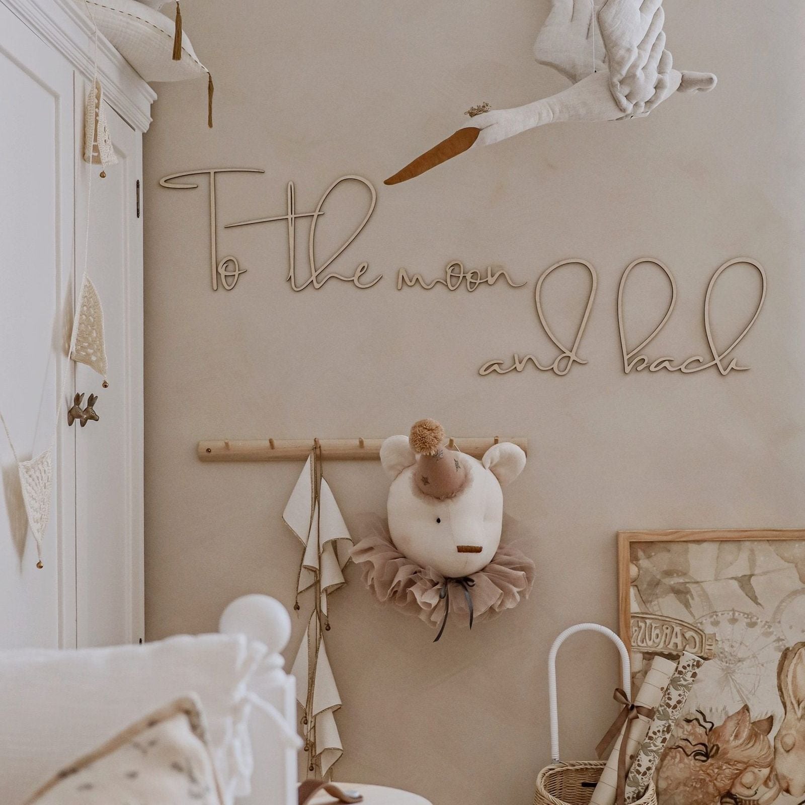 Prachtige houten wanddecoratie voor de baby- of kinderkamer. Deze lieve tekst is de perfecte finishing touch aan de muur en brengt een warme, persoonlijke sfeer in de ruimte.