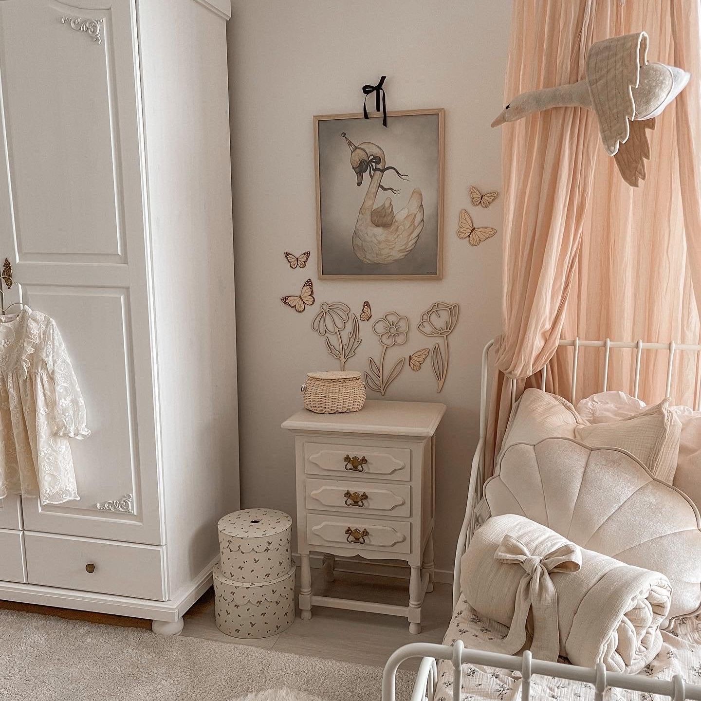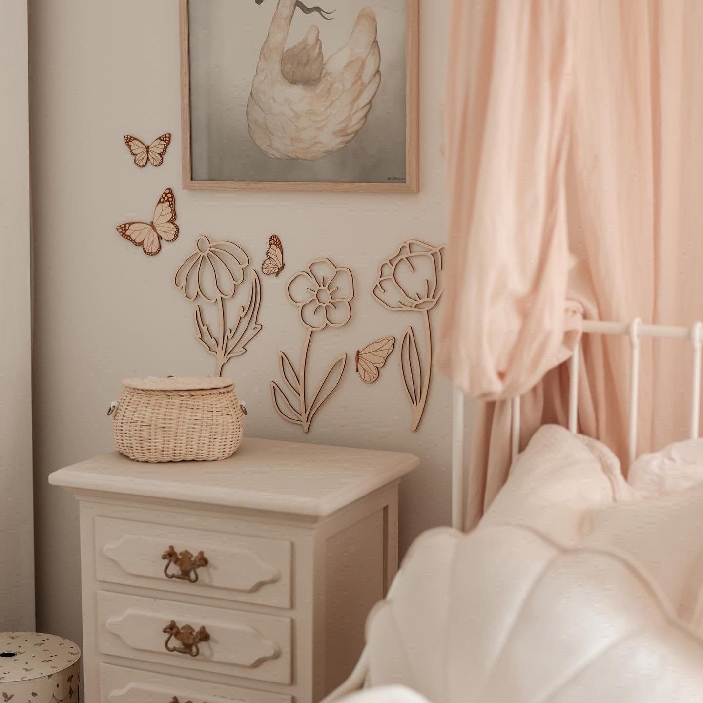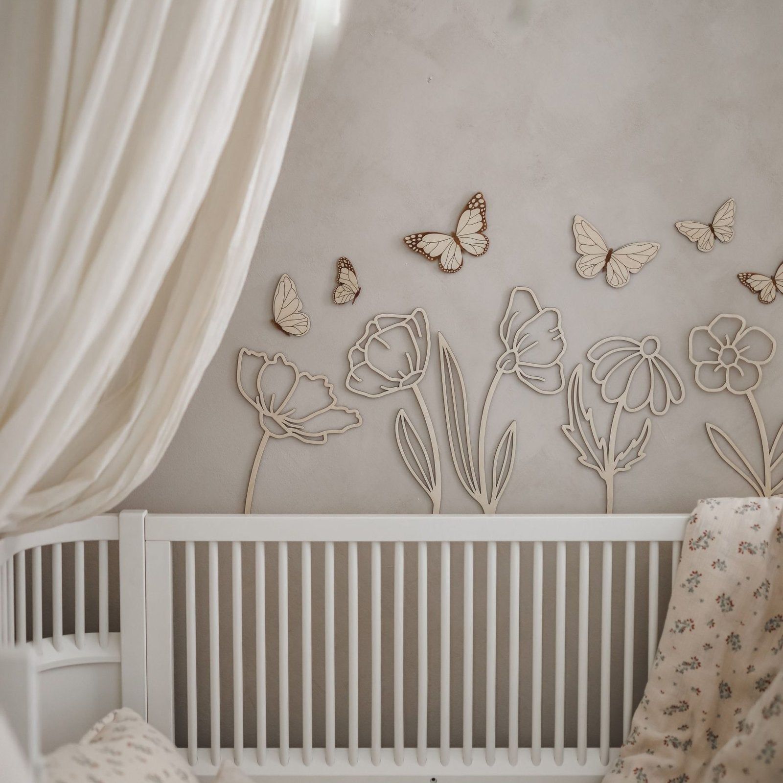 Prachtige houten bloemen- en vlinderset voor aan de muur – een betoverende toevoeging aan elke baby- of kinderkamer. Perfect om een zachte, natuurlijke sfeer te creëren.