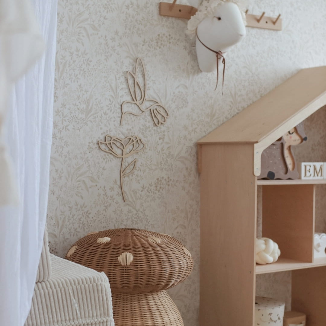 Breng een vleugje magie in de kinderkamer met deze houten kolibrie en bloem. Een dromerig detail dat zorgt voor een lieve en speelse sfeer. De set wordt geleverd met bevestigingstape, zodat je hem eenvoudig aan de muur kunt plaatsen.