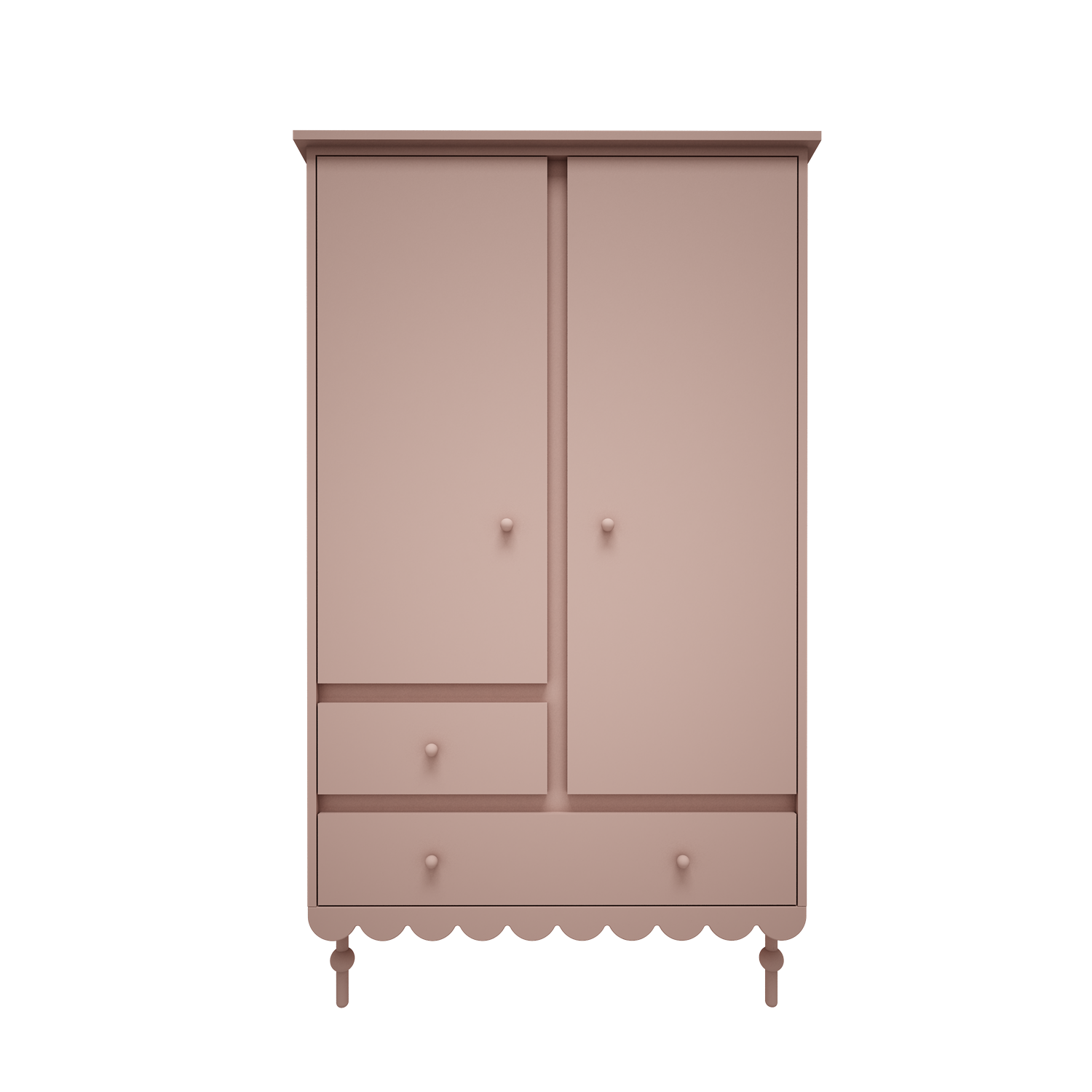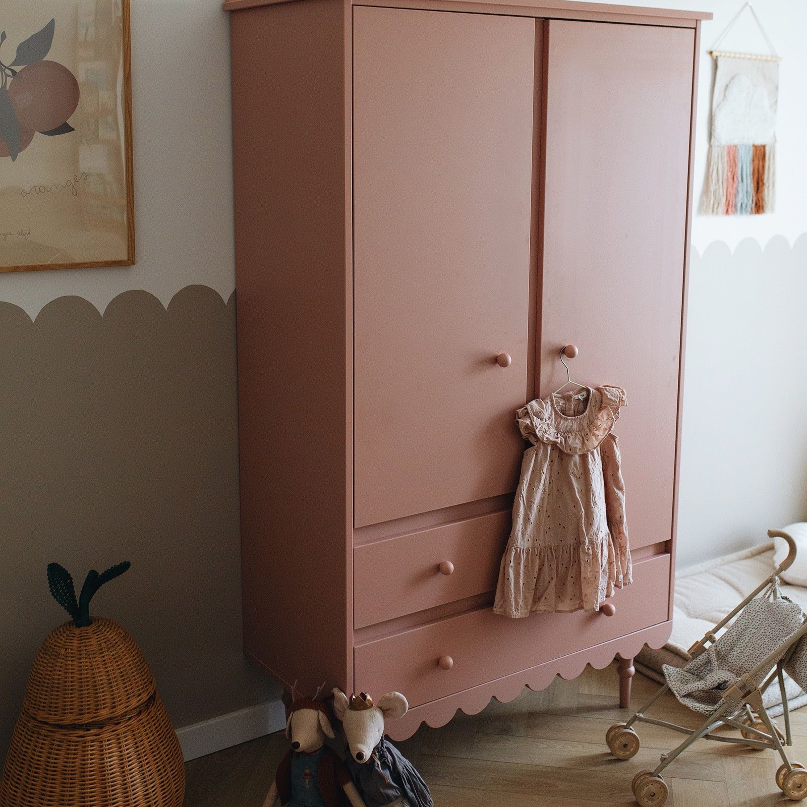 Uiterst charmante garderobe in retrostijl. Het heeft een ruimte voor het ophangen van kleding, aangepast aan kleding voor pasgeborenen en oudere kinderen, ruimte met planken en twee lades. De lade en de deur zijn voorzien van geleiders van zeer goede kwaliteit en zelfsluitende scharnieren.