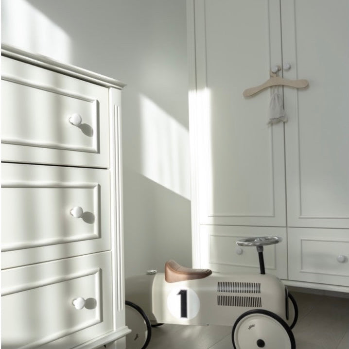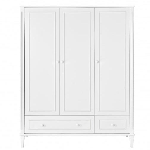 Deze drie deurs kledingkast brengt rust, stijl en verfijning in de babykamer. Geïnspireerd door de klassieke art deco-stijl kenmerken de meubels zich door subtiele gefreesde details, porseleinen knopjes en sierlijke handgemaakte poten. Samen zorgen deze elementen voor een tijdloze en luxe uitstraling.