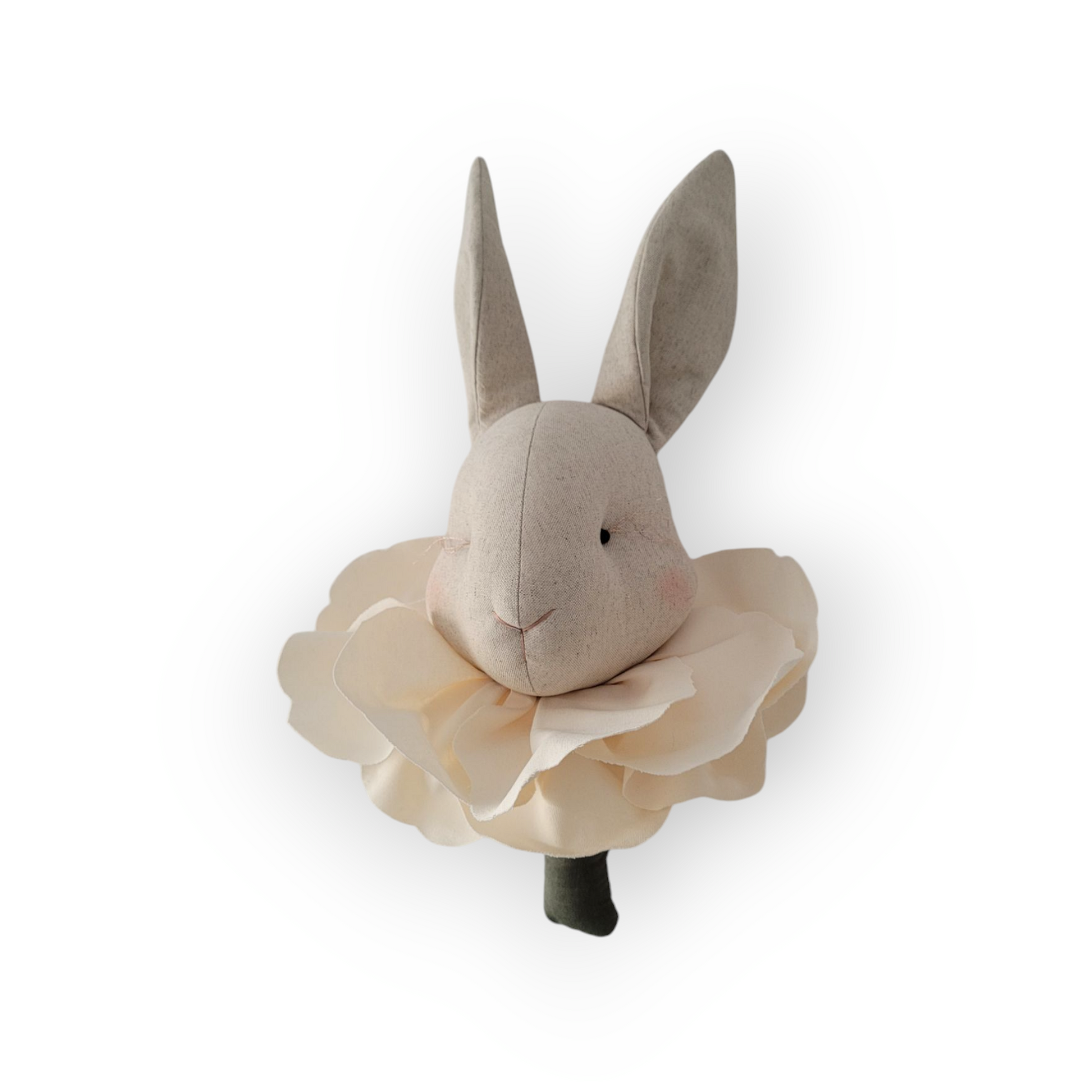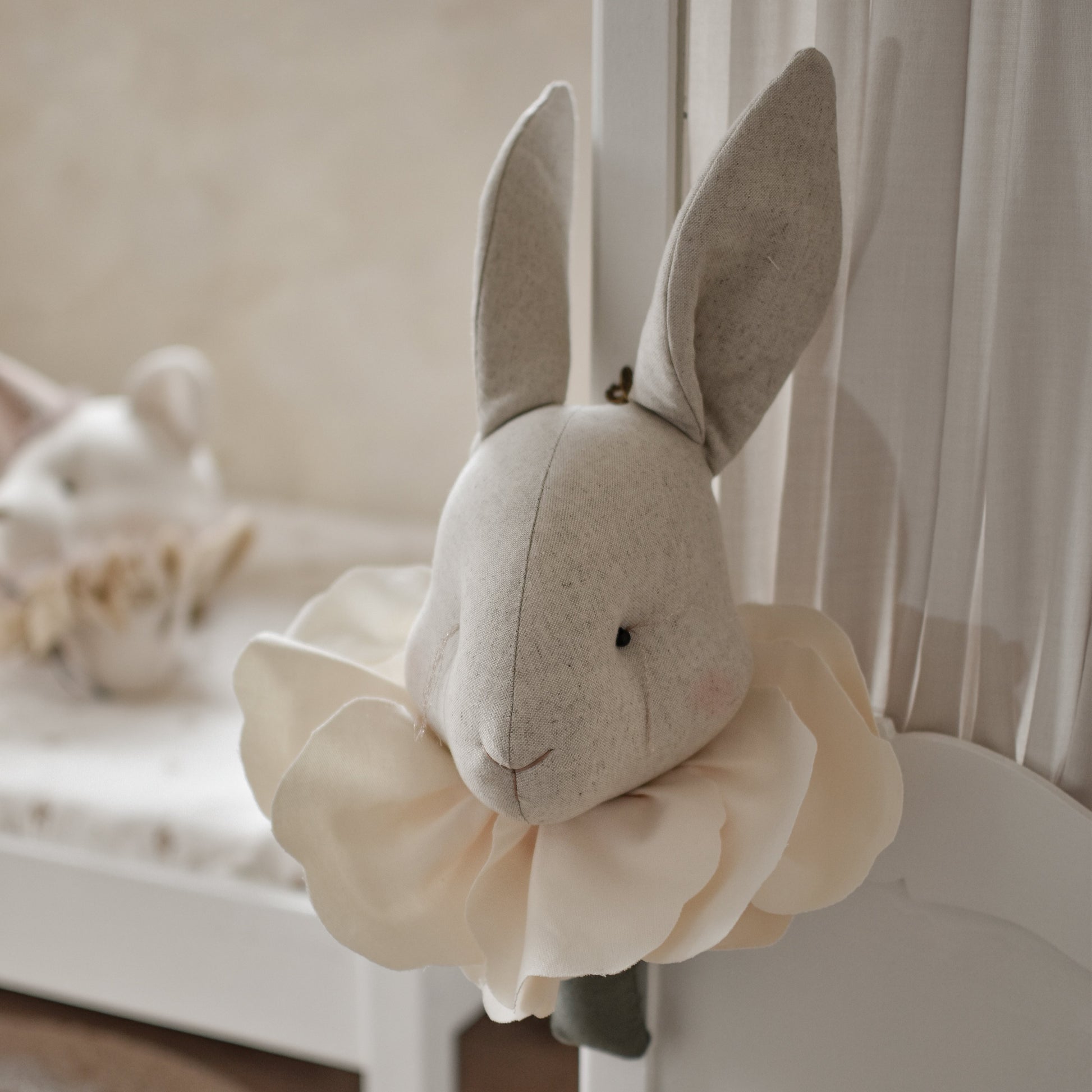 Breng een vleugje magie in de kinderkamer met dit schattige konijntje. Dit handgemaakte konijntje is een prachtige en unieke toevoeging aan elke kinderkamer. Met zijn natuurlijke uitstraling en zachte ivoren bloemenkraag straalt het een dromerige en verfijnde sfeer uit. Perfect om op te hangen aan de muur, boven het bed of als subtiele blikvanger in een speelhoek. Gemaakt van hoogwaardige materialen en met oog voor detail, waardoor elk stuk uniek is. Dit konijntje past perfect in een romantische, bohemian of sprookjesachtige kinderkamer en is een prachtig cadeau voor kleine dierenvriendjes. Een tijdloos decoratiestuk dat warmte en charme toevoegt aan elke ruimte.