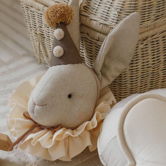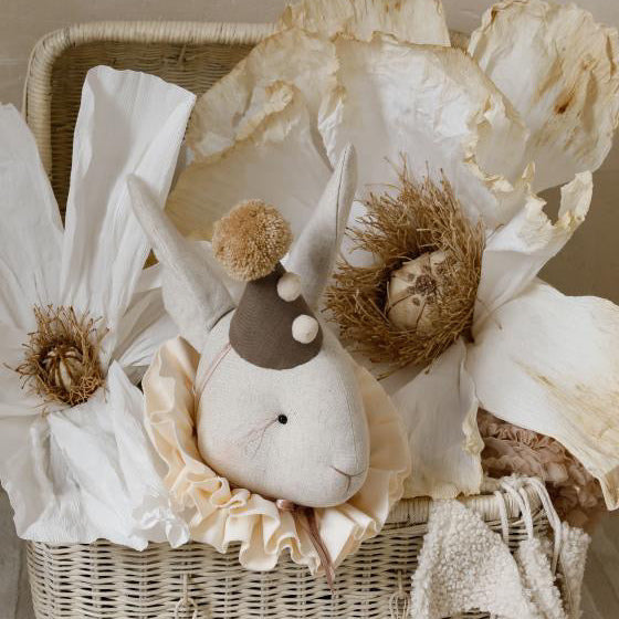 Met de hand gemaakte linnen lieve konijnen wanddecoratie die een vleugje magie en charme toevoegt aan elke kinderkamer.