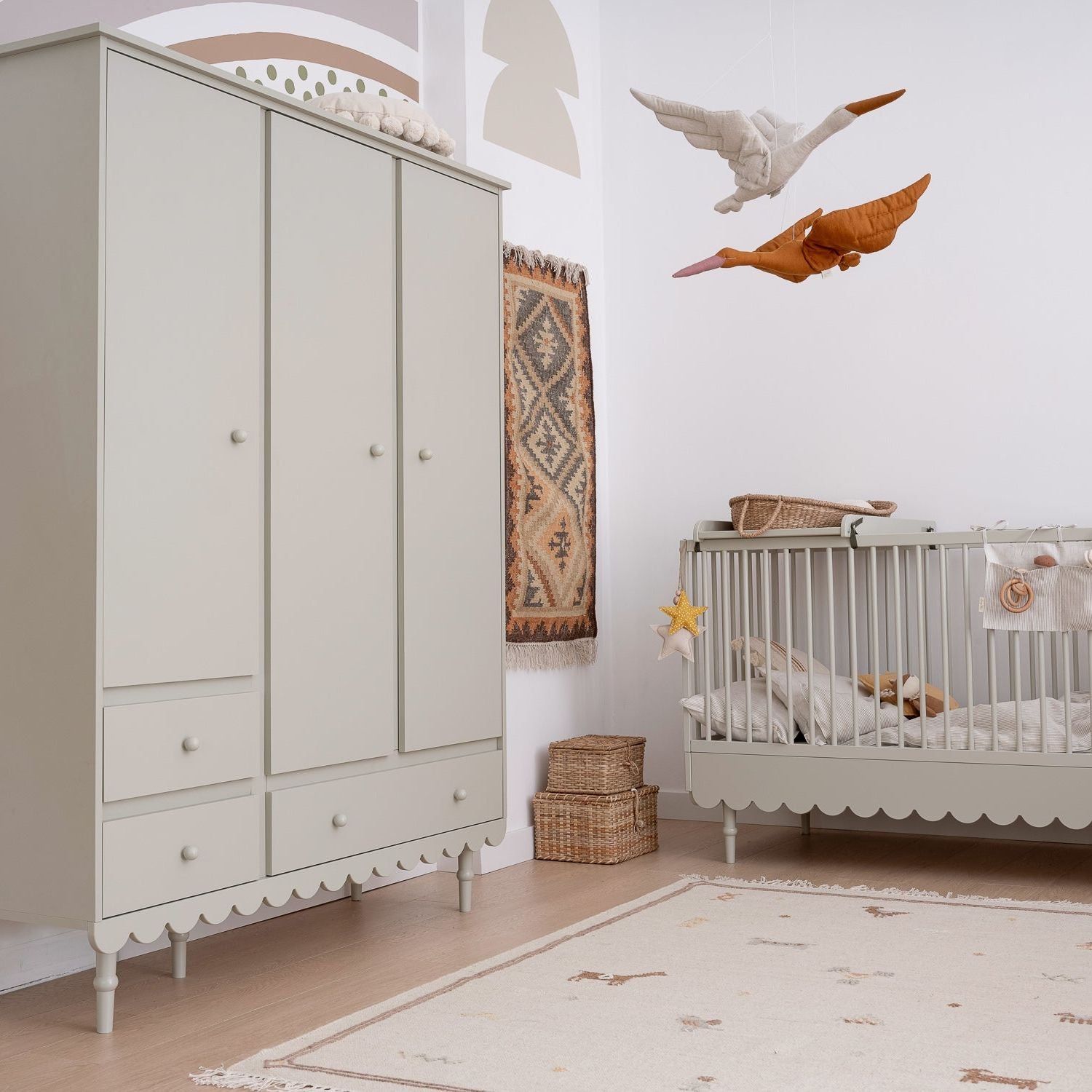 Een stijlvol bed in retrolook met drie verstelbare matrasstanden. Eén van de zijframes bevat drie uitneembare spijlen, zodat je kindje zelfstandig uit bed kan stappen. Het bedje is om te bouwen tot een peuterbed en vormt samen met de andere Babushka-meubels een prachtig geheel.