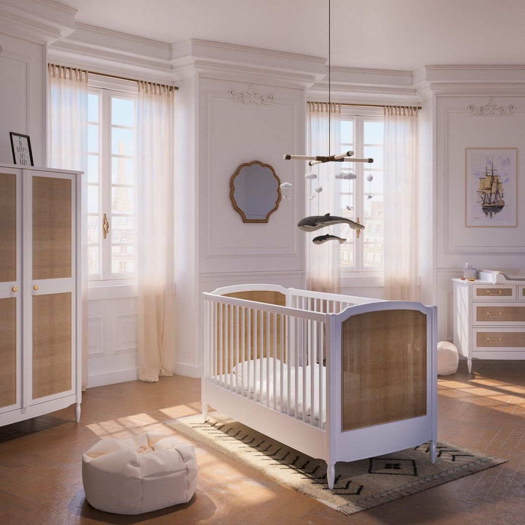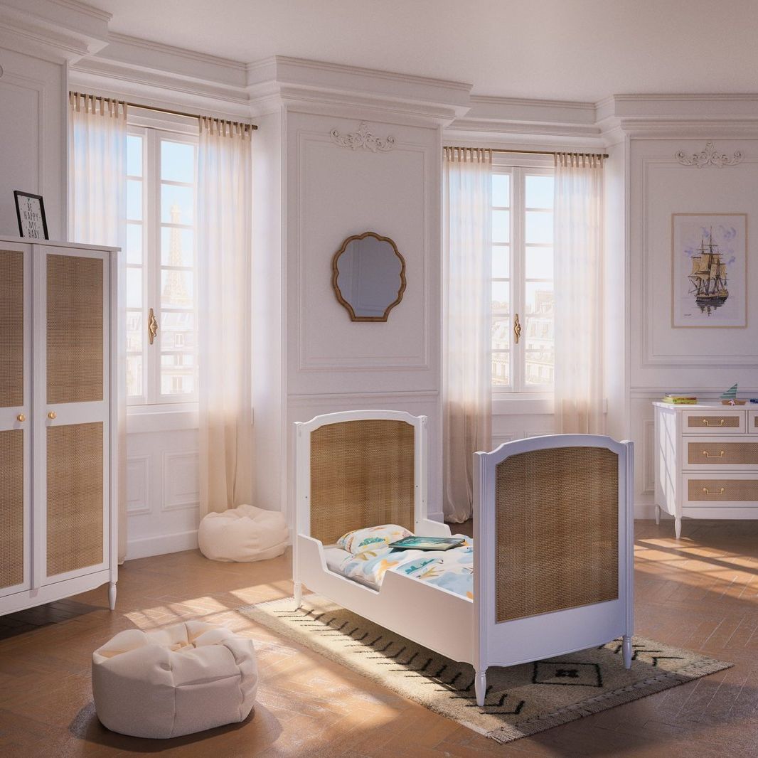 Dit ledikant straalt tijdloze elegantie uit. Het bedje biedt twee matrashoogtes. Rotanweefsel op het hoofd- en voeteinde en panelen van duurzaam MDF. Het frame, de spijlen en de bedbodem zijn gemaakt van massief hout. Dit veelzijdige meubelstuk kan worden omgebouwd tot een kinderbedje en een bank, zodat het jarenlang een geliefd onderdeel van de ruimte van uw kind blijft.