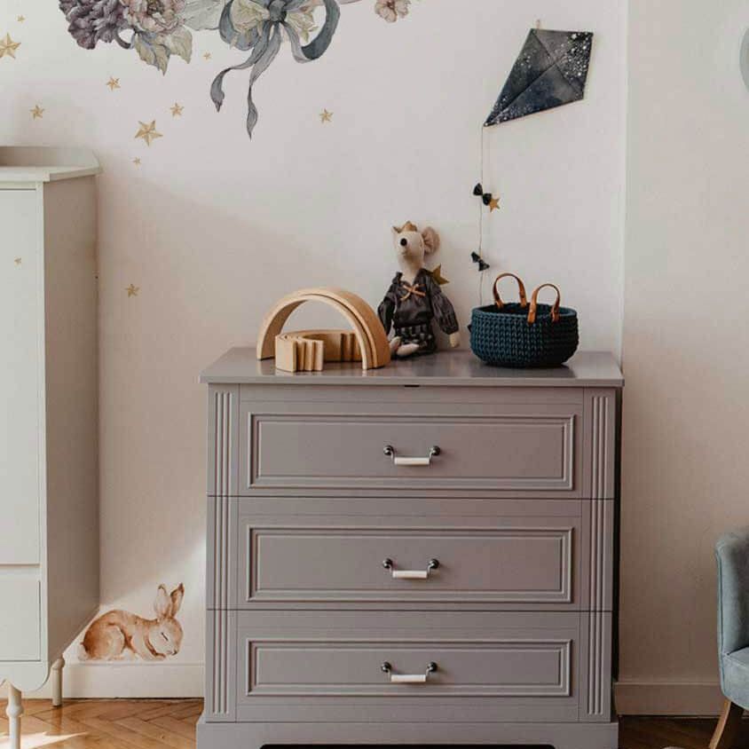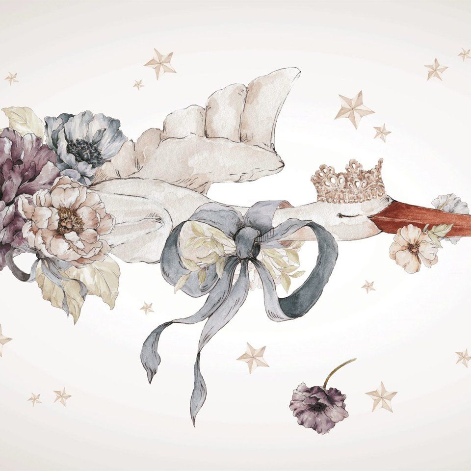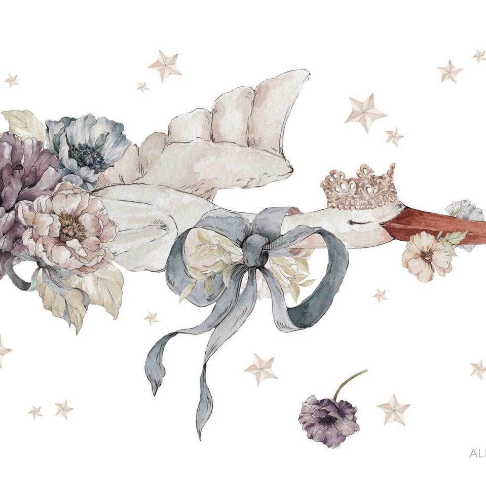 Prachtige wandsticker voor in de baby of kinderkamer. In samenwerking met het mooie merk DeKornik is deze prachtige dromerige wandsticker tot stand gekomen. De ooievaar heeft een mooie strik om en is omringt door bloemen welke ook op het behang uit deze collectie te zien zijn. Ideaal om te combineren! En niet alleen dat.. de ooievaar is ook tot leven gekomen in de vorm van een mobile! Hoe leuk om deze bij elkaar te hangen! Bij deze wandsticker worden ook sterretjes geleverd, deze kun je zelf plaatsen naar keuze. Deze wandsticker is voor zowel meisjes als jongens geschikt!