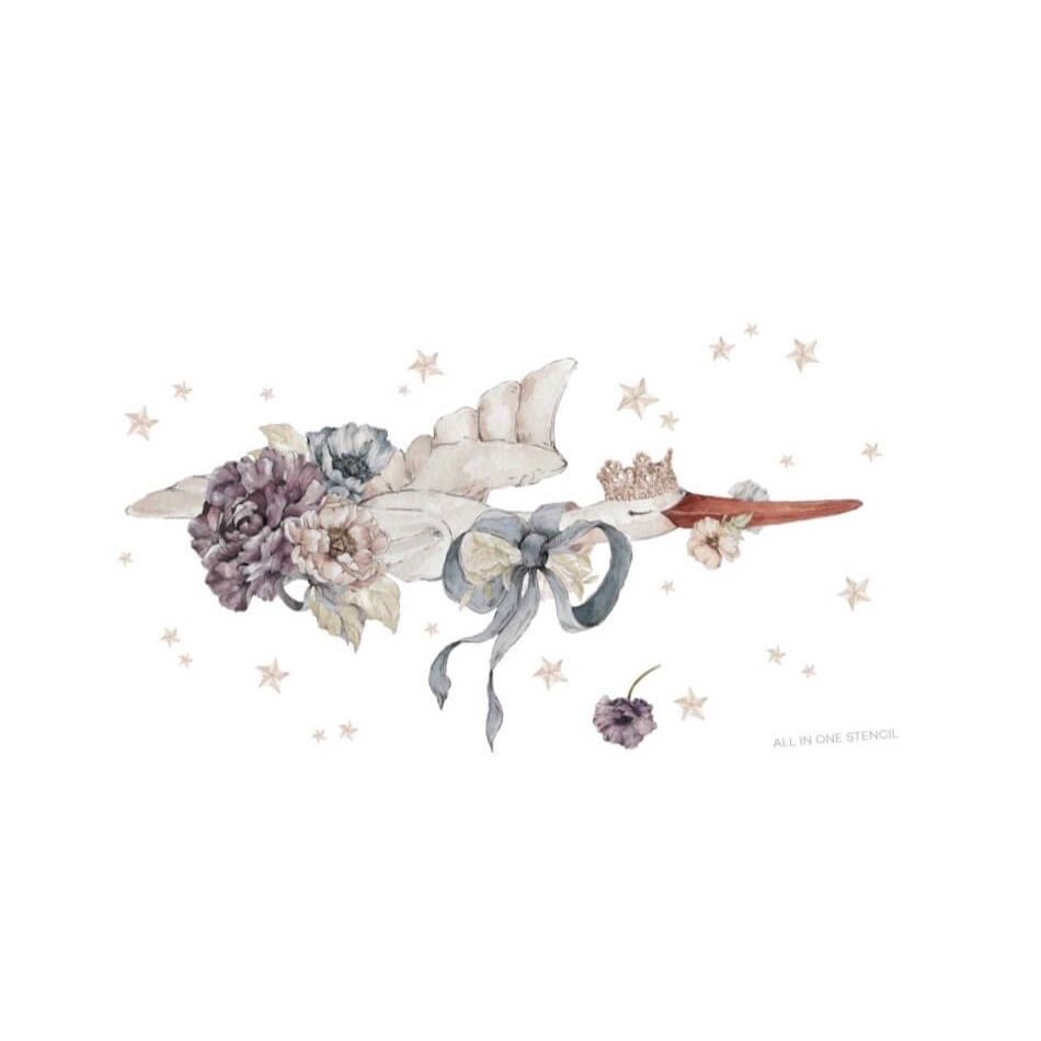 - Afmeting: Volledig stencil: 100 cm x 60 cm, Maat ooievaar 87 x 45 cm cm. Maat sterren:Variërend van 2 cm to 5 cm.