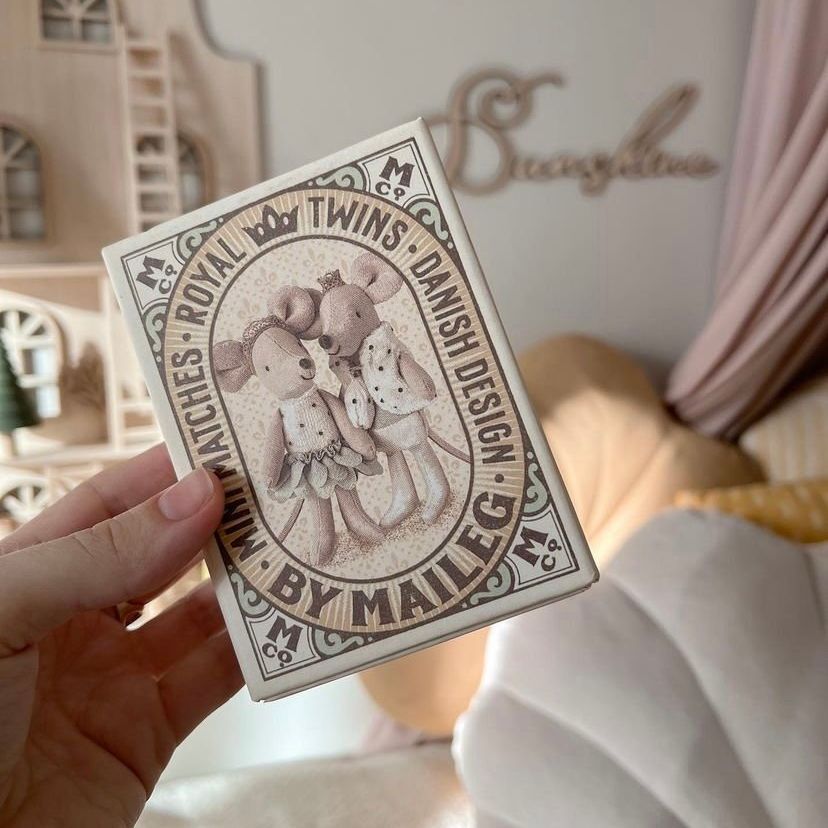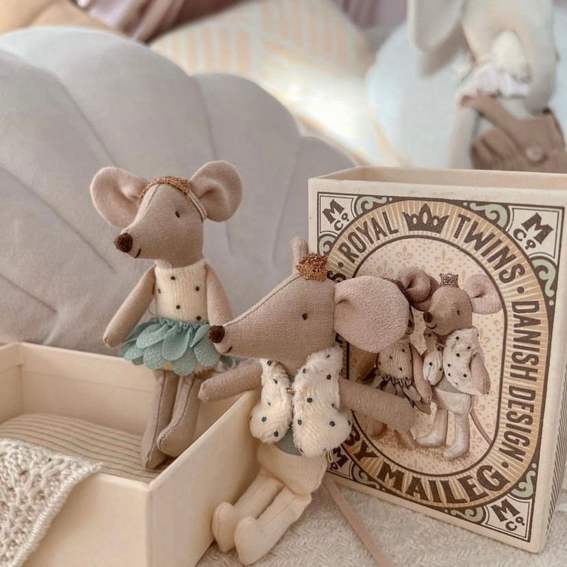 De koninklijke muizenfamilie wordt groter met deze tweeling. Ze dragen gouden kronen en mooie kleren. Ze slapen in een mooi versierd luciferdoosje.