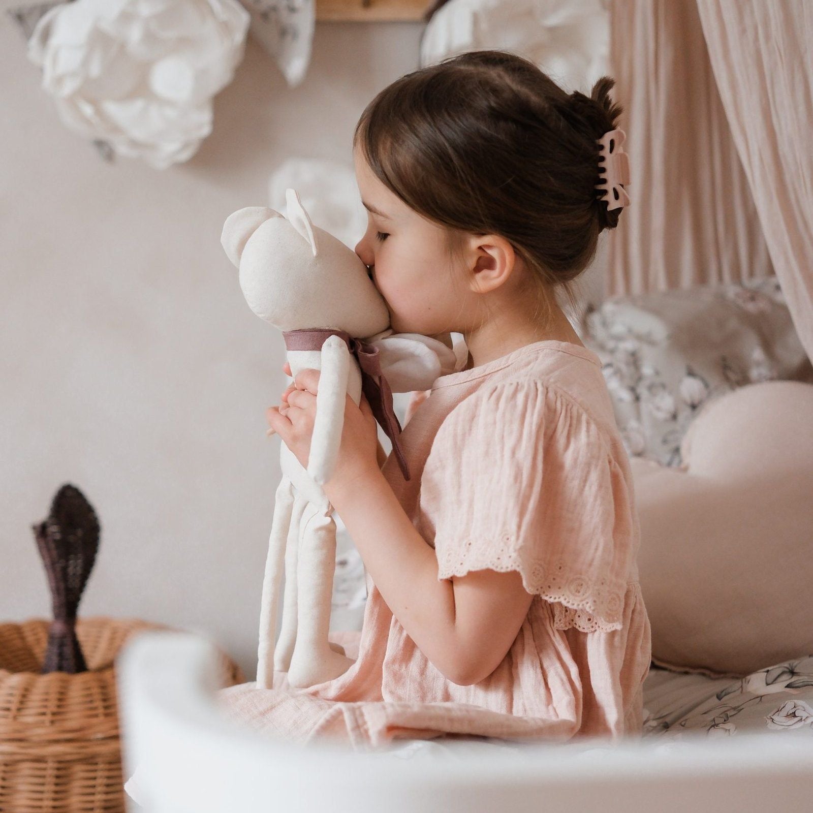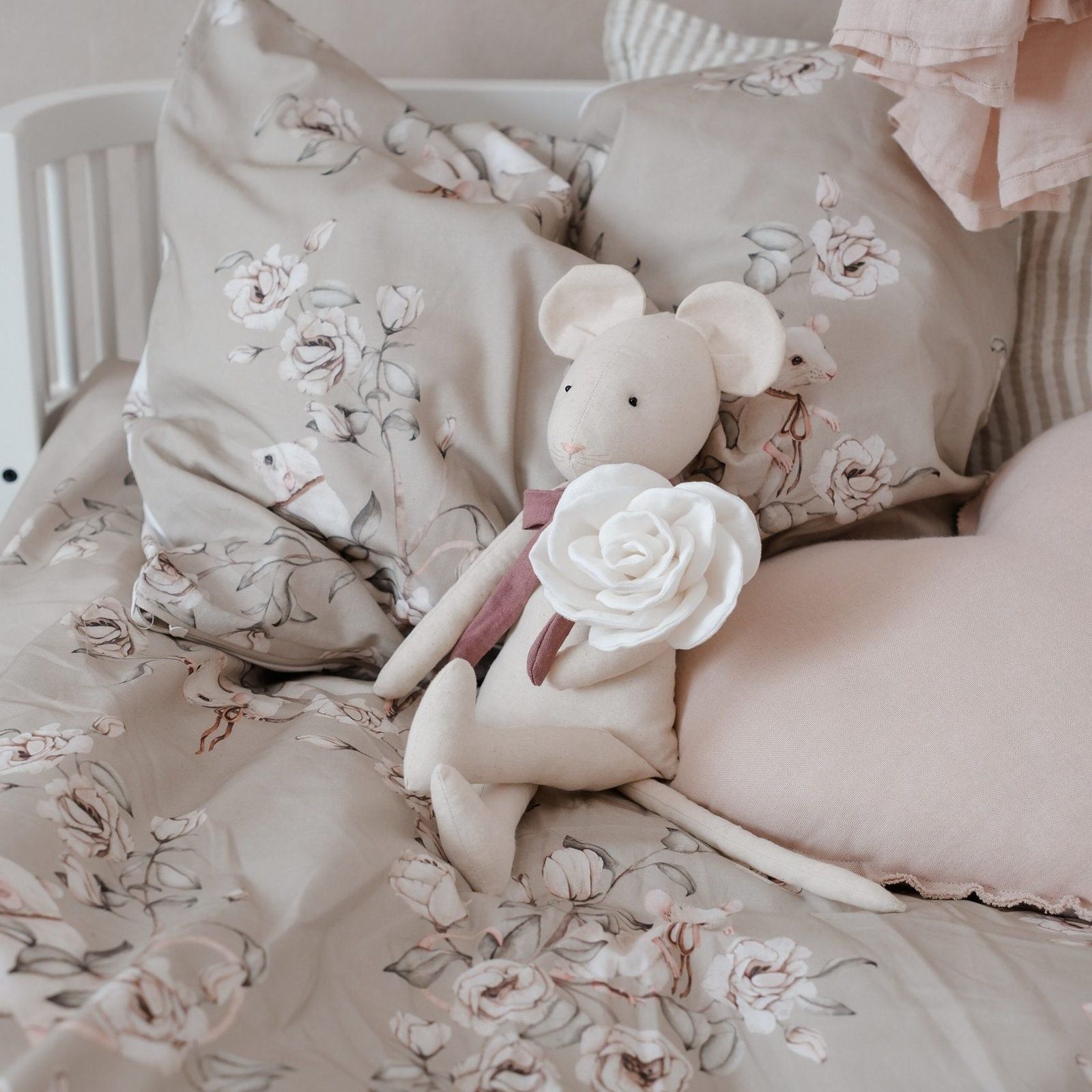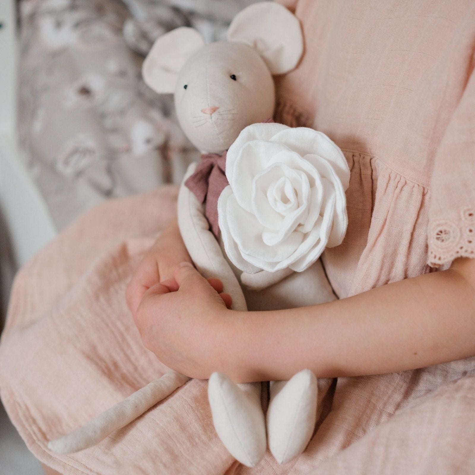 Prachtig handgemaakte muizen pop. Deze muis heeft een lief strikje om en heeft een bloem vast welke je ook los kunt halen.Deze pop is binnen de Floral Mice Collection verkrijgbaar in beperkte oplage. Combineer deze lieve muis met de items uit de ' Floral Mice' collectie.