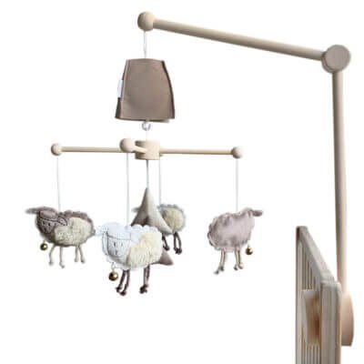 De mobiel draait en het muziekdoosje is verstopt onder een "dop". Na het opwinden draaien de schaapjes ongeveer 4 minuten zachtjes rond.