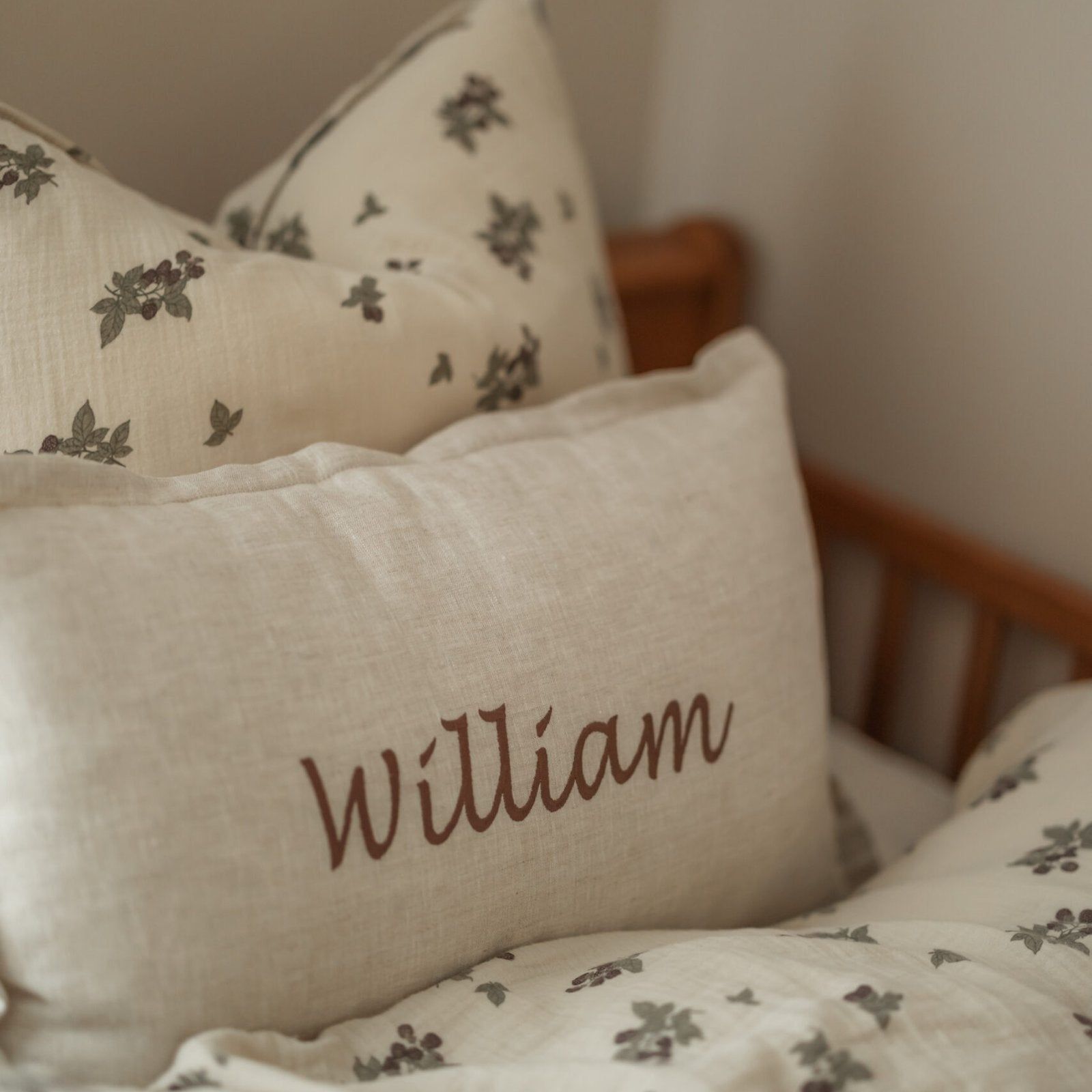 Prachtig linnen sierkussen met daarop de naam van jouw kindje! Ideaal om te gebruiken ter decoratie van de kinderkamer maar ook een geweldig (kraam) cadeau! Het kussen is handgemaakt en genaaid van hoogwaardig linnen stof. Je kunt kiezen uit een kussen met frills ( dus ruches)of zonder. Jij kiest de kleur van het kussen en tevens van de naam! (Op de hoofdafbeelding is het kussen in naturel kleur te zien met bruin stiksel)