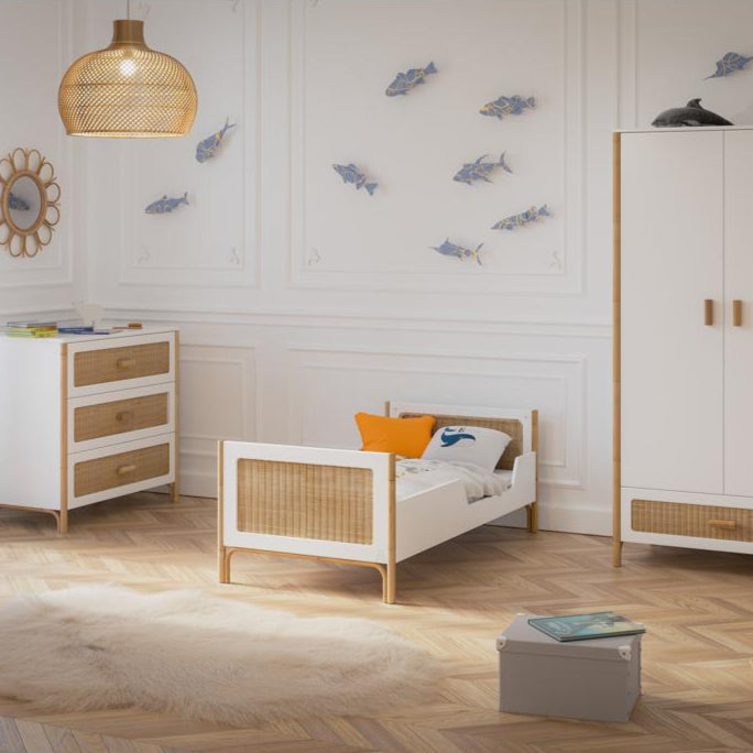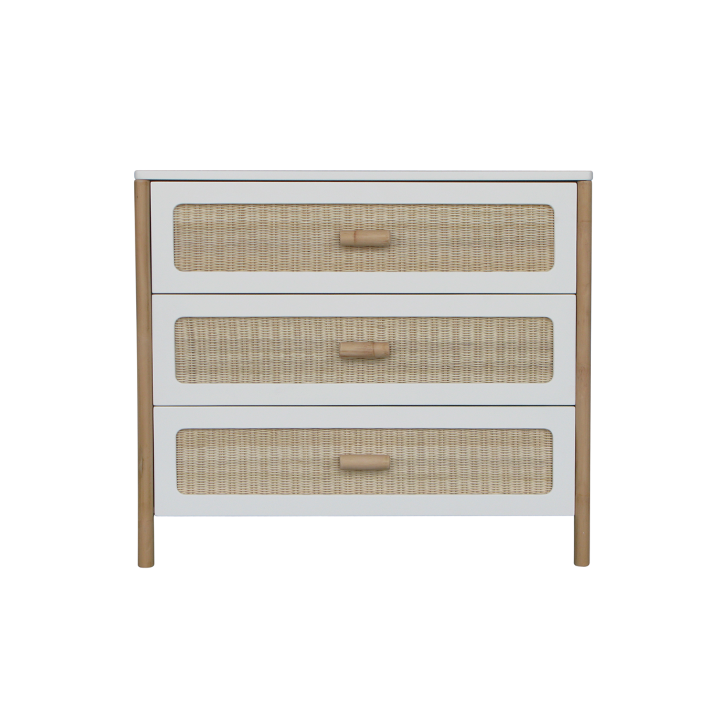 Dit elegante dressoir combineert praktisch gebruik met een natuurlijke uitstraling. Voorzien van drie ruime lades met soft close sluitingen, rotan webbing panelen en poten van rotan riet. De optionele commode-opzet kan er stevig op geplaatst worden, zowel in de lengte als in de breedte.