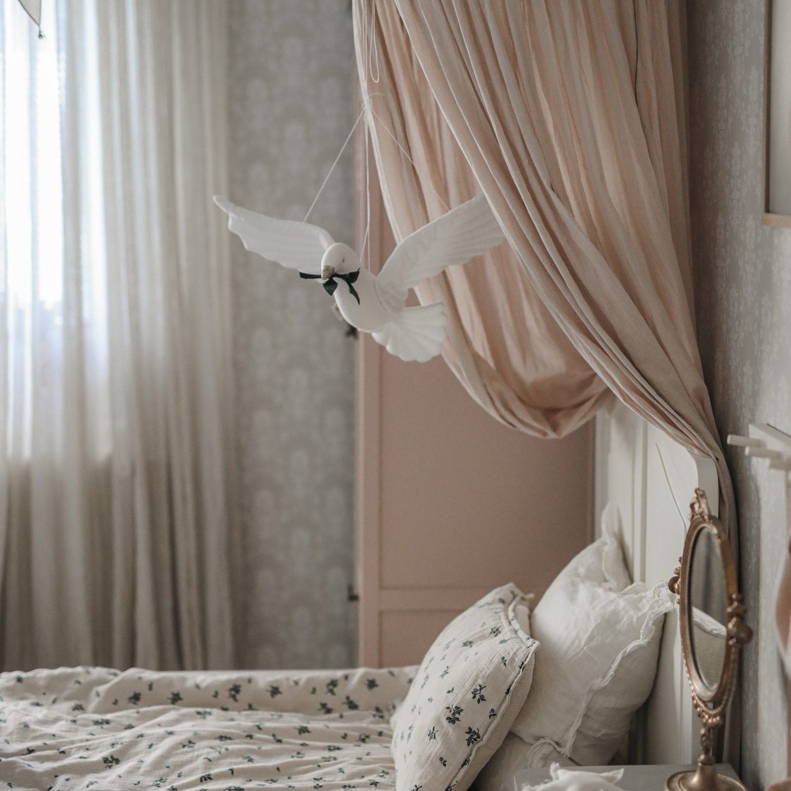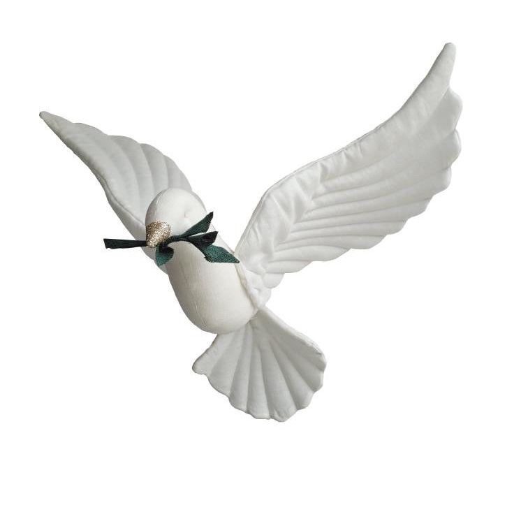 Hoe mooi zijn deze handgemaakte linnen duifjes? Het glitter snaveltje houd een takje vast! Handgemaakt met liefde, en dat zie je! Waar ga jij deze ophangen? Onder het bedhemeltje, aan het plafond? Dit duifje is verkrijgbaar in meerdere kleuren. Let op: Dit item is puur ter decoratie, laat je kind hier niet mee spelen. Buiten bereik van kinderen houden.