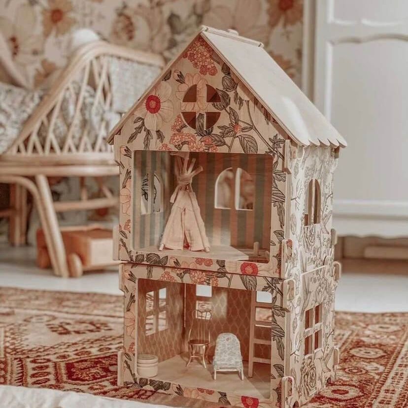 Levertijd 1-4 werkdagen Prachtig poppenhuis bestaande uit twee verdiepingen met gekleurde bloemen en tevens zwart omlijnde bloemen. Alle elementen hebben veilige vormen en zijn bedekt met natuurlijke oliën. Dit poppenhuis is gemaakt van delicaat berkenmultiplex van 6 mm dik. Multiplex heeft FSC-certificaten.- Dimensies: verdieping met dak - hoogte - 38cm / breedte - 33cm / diepte - 23cm/ Volgende verdieping - hoogte - 23cm / breedte - 33cm / diepte - 23cm