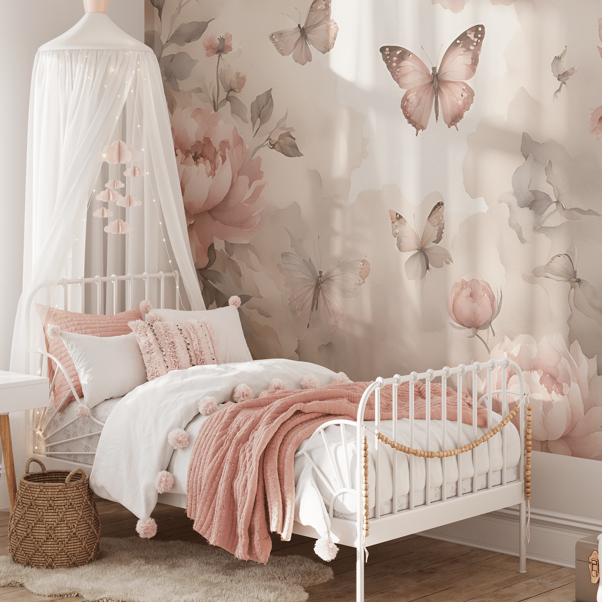 Prachtig behang met vlinder print. Gedrukt op hoogwaardig fleece, zorgt het voor duurzaamheid en weerstand tegen beschadiging.