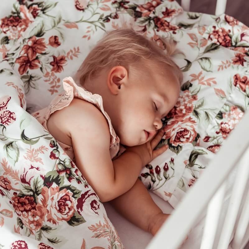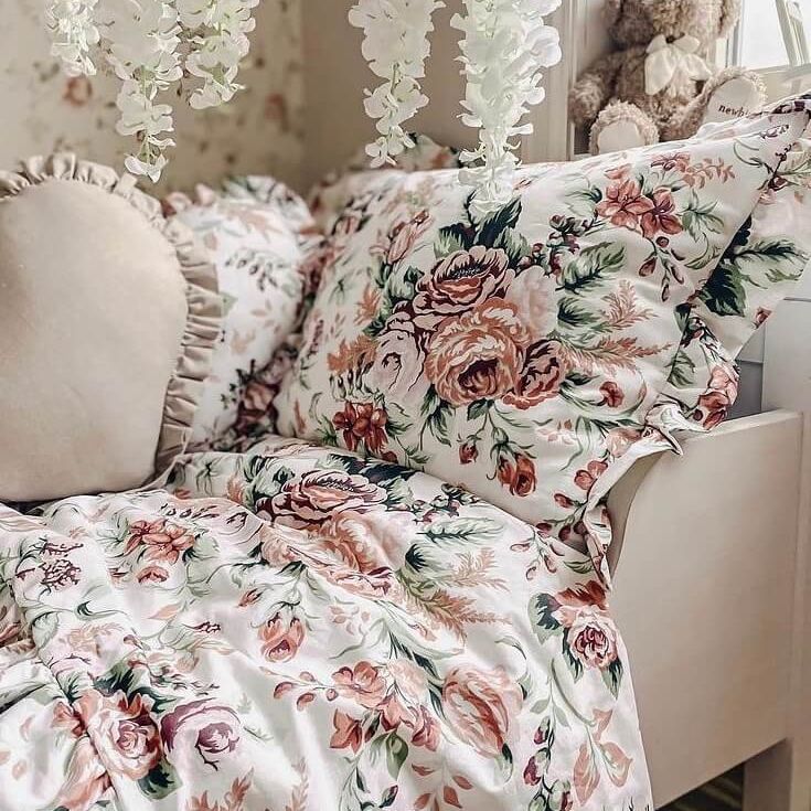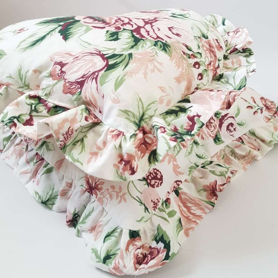 Prachtig beddengoed met bloemen, afgezet met ruches.