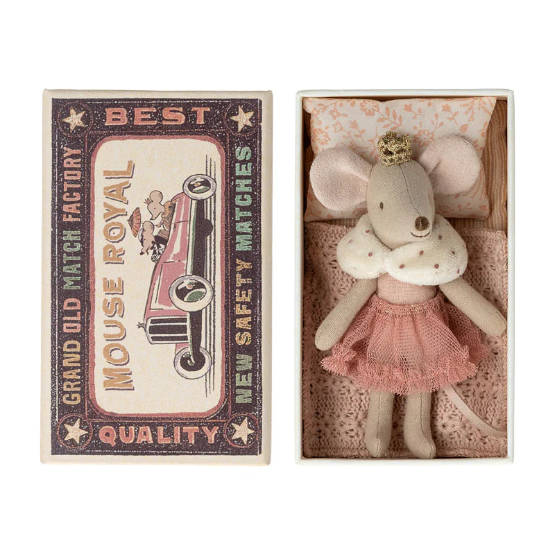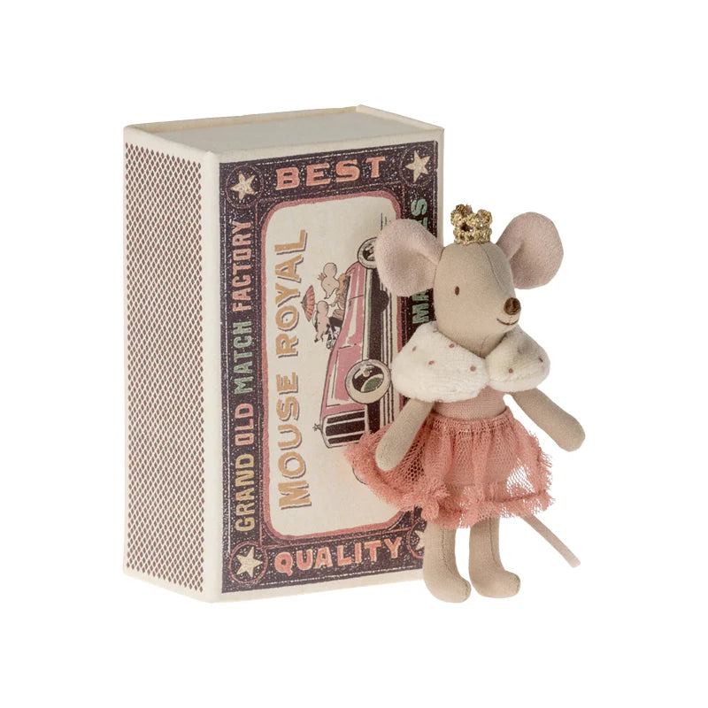 Wat een schatje! Maileg prinses muis in lucifer doosje (kleine zus) is een klassiek Maileg item dat klaarstaat voor heel veel speelplezier. Dit schattige muisje rust comfortabel uit in een klein luciferdoosje. De kleding en beddengoed zijn voorzien van prachtige prints en kleuren, hoewel de kleur van het beddengoed kan variëren.