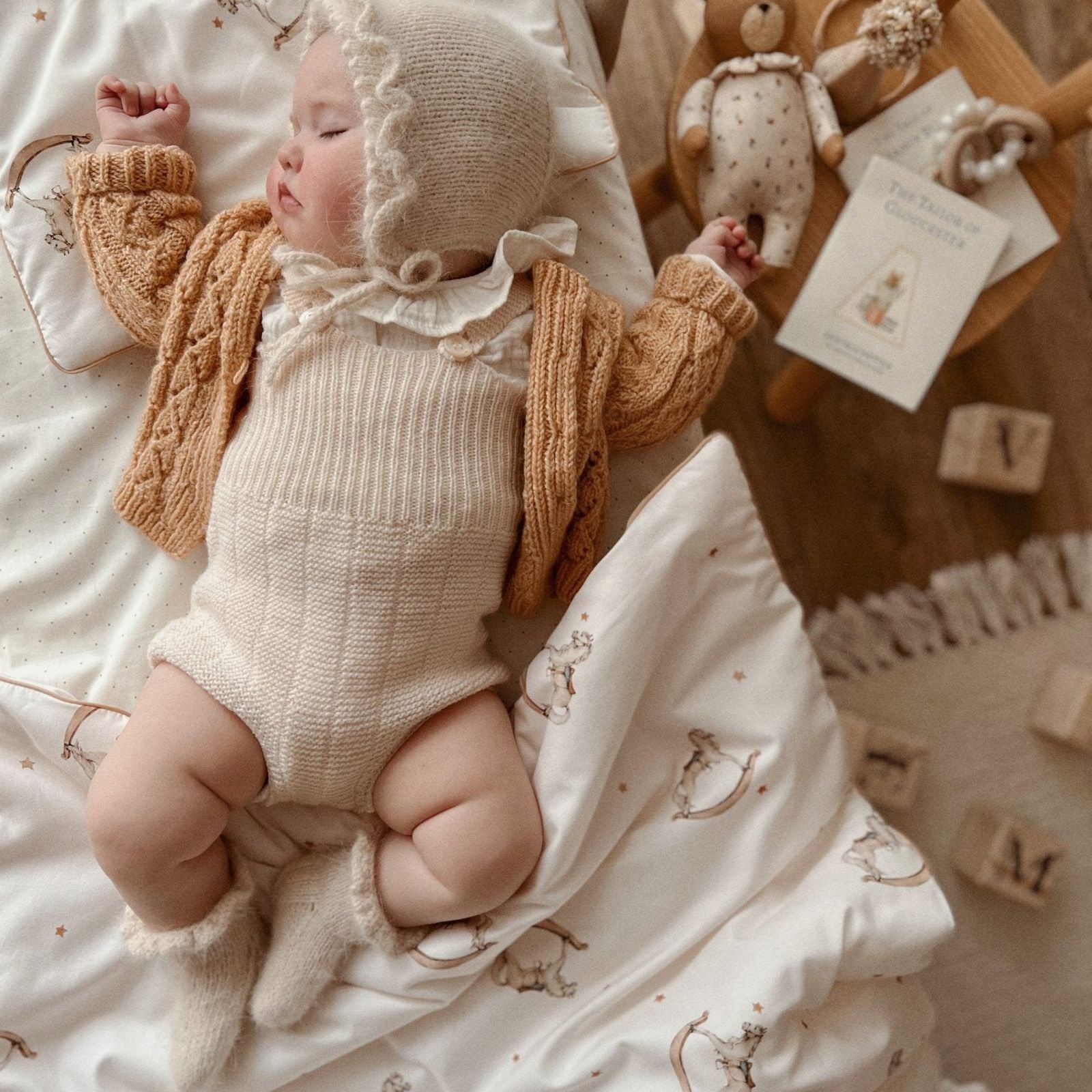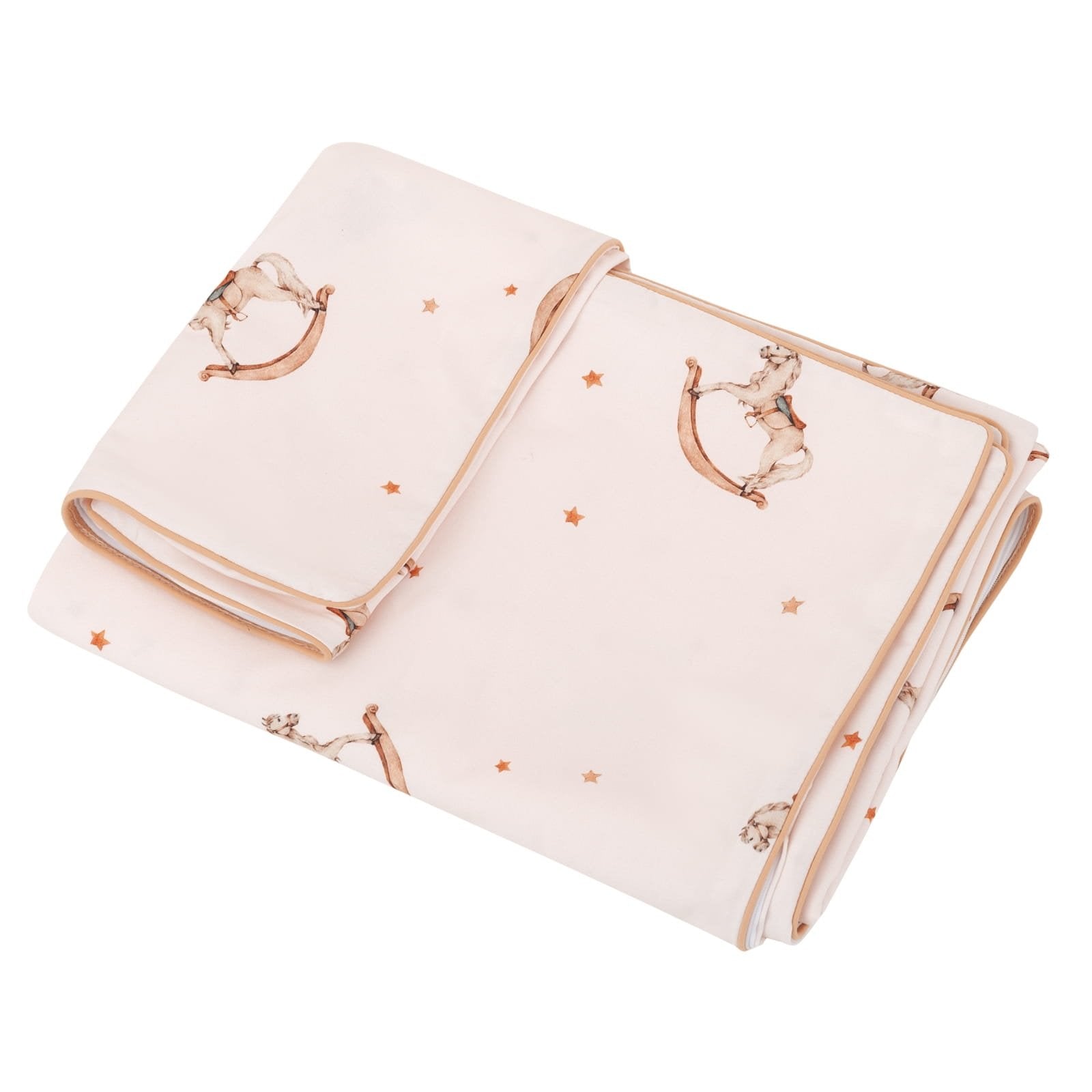 Prachtig beddengoed met hobbelpaard print.Deze set komt in een mooie katoenen opbergtas met dezelfde leuke print!