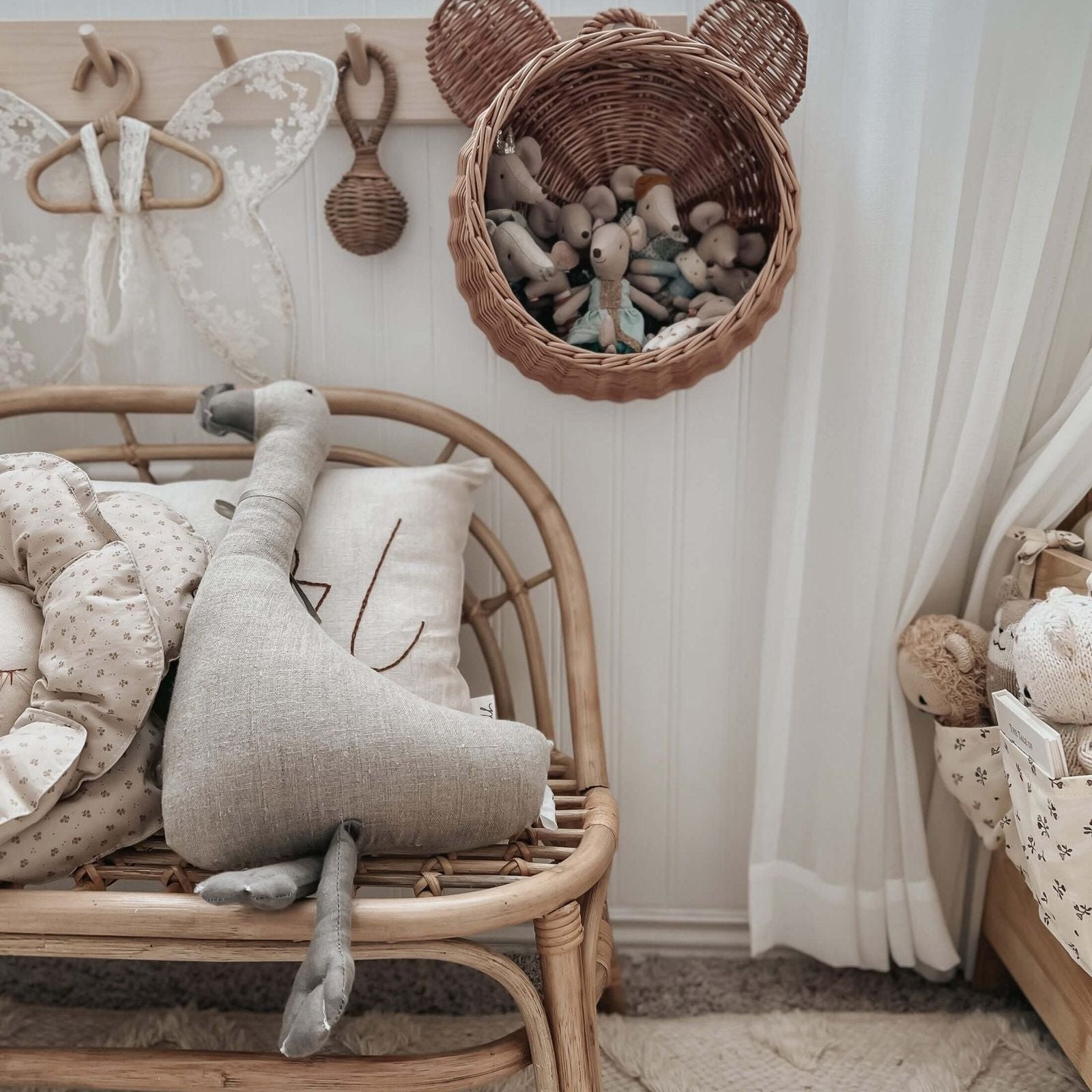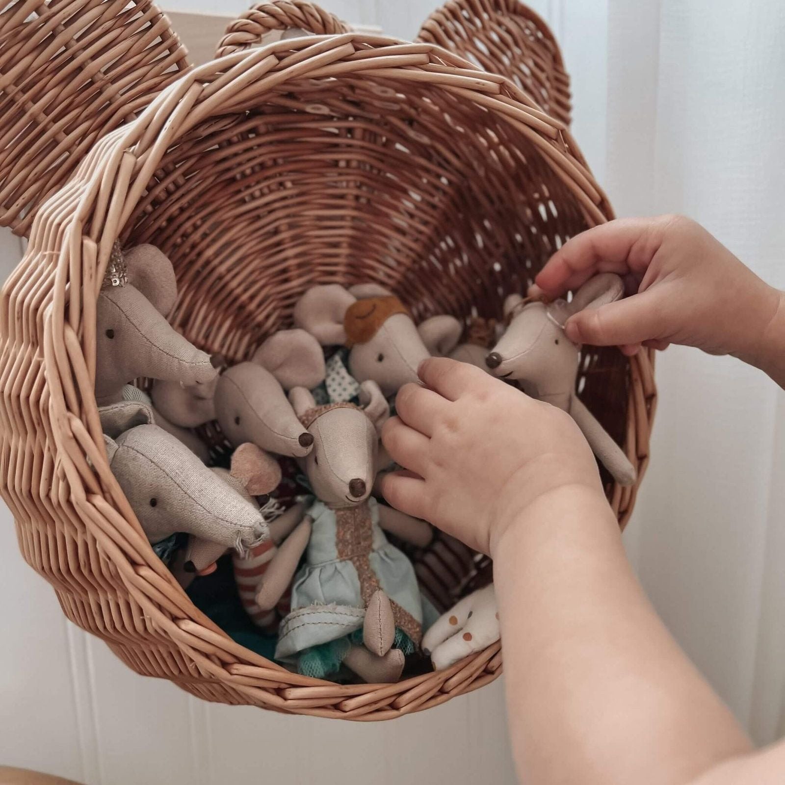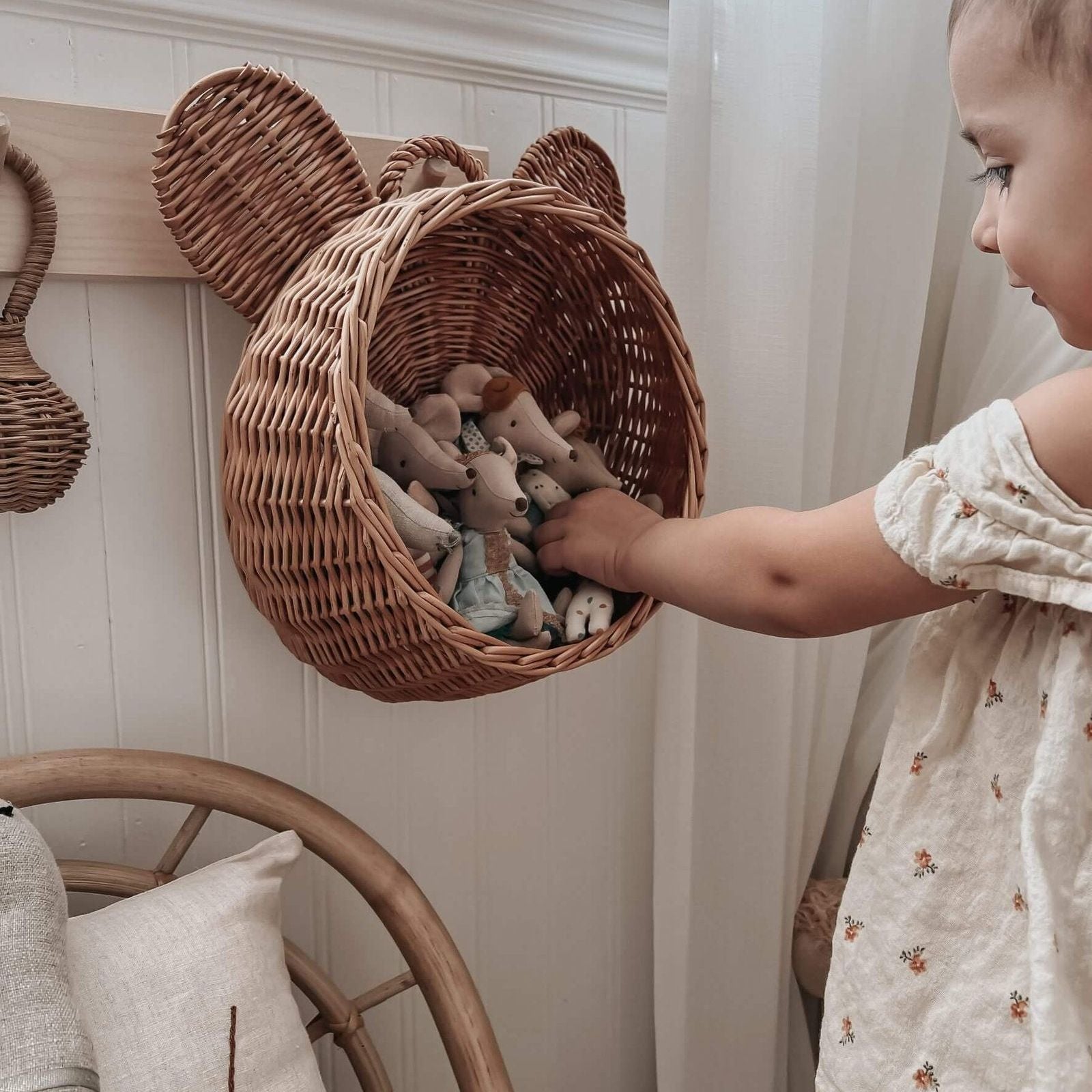 Deze mooie handgemaakte rieten mand is perfect voor het opbergen van de wat kleinere spullen. Berg hier bijvoorbeeld de blokken in op of de muizenpoppetjes. Om aan de muur te hangen, maar ook aan een kast of kapstok staat deze erg lief!
