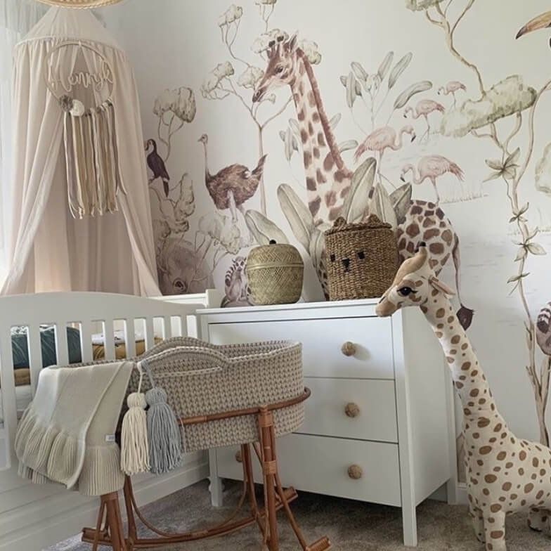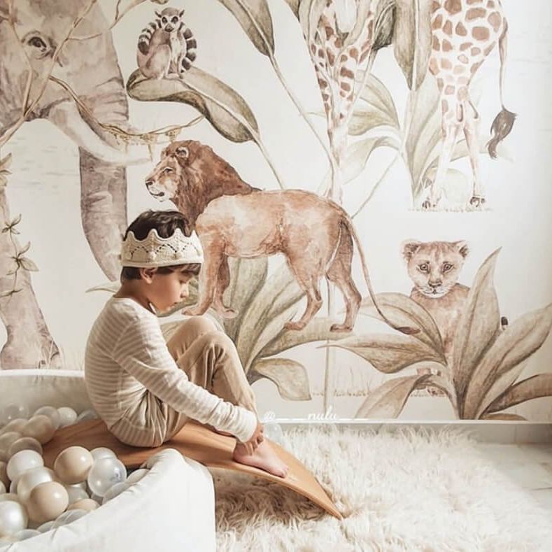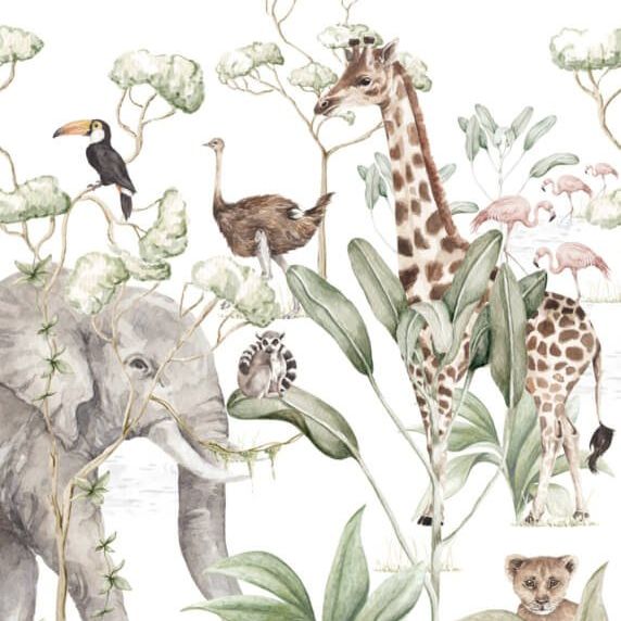 Wat een droom behang is dit! Een echte paradijselijke wereld, African Savannah Adventure met veel dieren waar elk kind dol op is!Het behang begint met een olifant. Een halve olifant om precies te zijn, want het hele figuur zou ongeveer 150 cm - 180 cm zijn en in sommige gevallen neemt het de helft van de kamer in beslag! Dat is de reden waarom onze olifant één keer op het behang verschijnt als het ons patroon inluidt, en dan verdwijnt het. Het patroon wordt herhaald, maar zonder de olifant.
